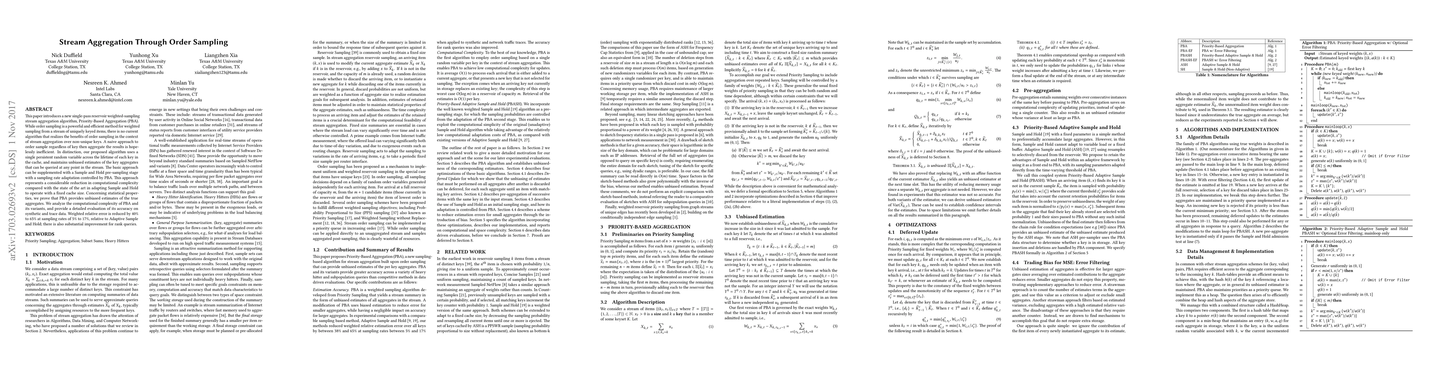 This is paper introduces a new single-pass reservoir weighted-sampling stream aggregation algorithm, Priority-Based Aggregation (PBA). While order sampling is a powerful and e cient method for weighted sampling from a stream of uniquely keyed items, there is no current algorithm that realizes the benefits of order sampling in the context of stream aggregation over non-unique keys. A naive approach to order sample regardless of key then aggregate the results is hopelessly inefficient. In distinction, our proposed algorithm uses a single persistent random variable across the lifetime of each key in the cache, and maintains unbiased estimates of the key aggregates that can be queried at any point in the stream. The basic approach can be supplemented with a Sample and Hold pre-sampling stage with a sampling rate adaptation controlled by PBA. This approach represents a considerable reduction in computational complexity compared with the state of the art in adapting Sample and Hold to operate with a fixed cache size. Concerning statistical properties, we prove that PBA provides unbiased estimates of the true aggregates. We analyze the computational complexity of PBA and its variants, and provide a detailed evaluation of its accuracy on synthetic and trace data. Weighted relative error is reduced by 40% to 65% at sampling rates of 5% to 17%, relative to Adaptive Sample and Hold; there is also substantial improvement for rank queries