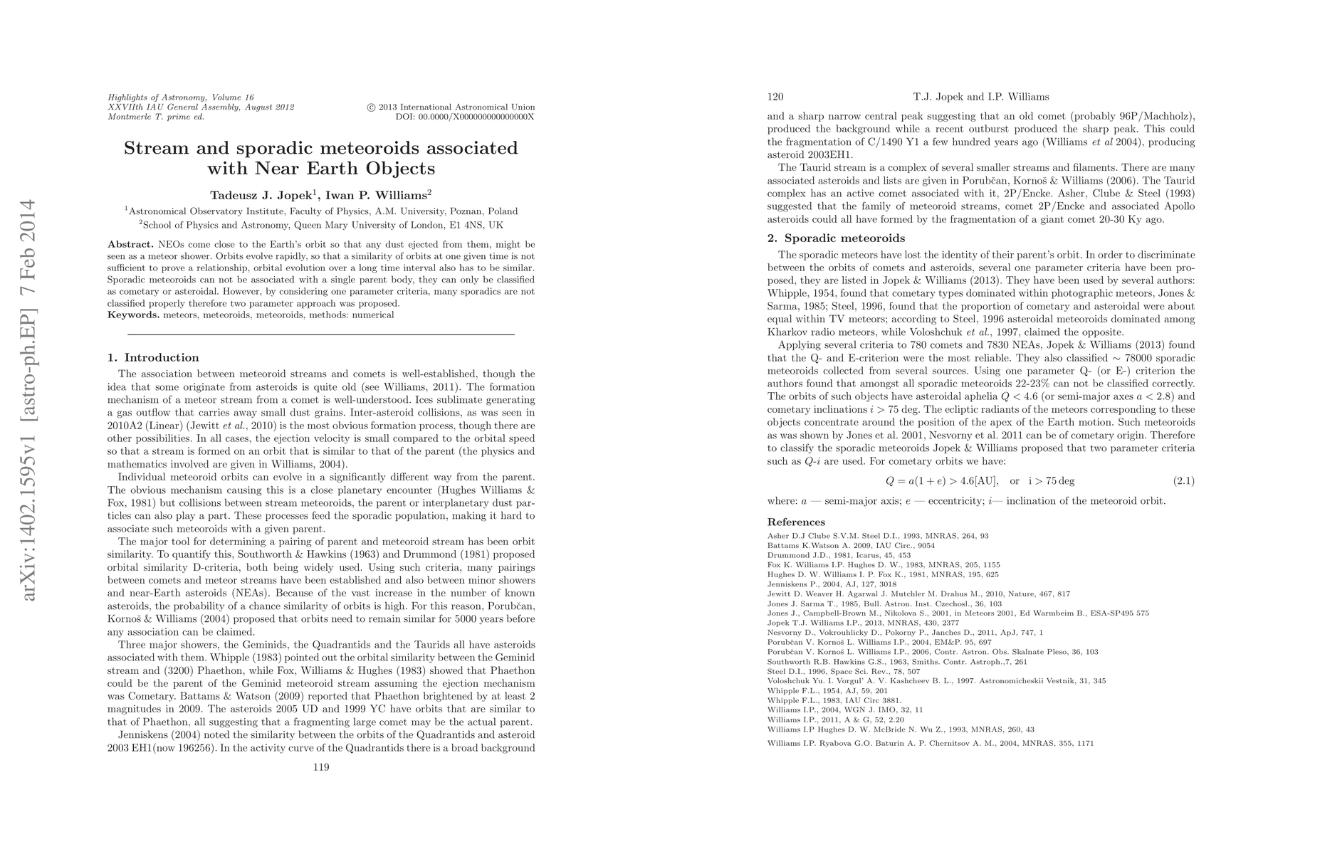 NEOs come close to the Earth's orbit so that any dust ejected from them, might be seen as a meteor shower. Orbits evolve rapidly, so that a similarity of orbits at one given time is not suffcient to prove a relationship, orbital evolution over a long time interval also has to be similar. Sporadic meteoroids can not be associated with a single parent body, they can only be classified as cometary or asteroidal. However, by considering one parameter criteria, many sporadics are not classified properly therefore two parameter approach was proposed.