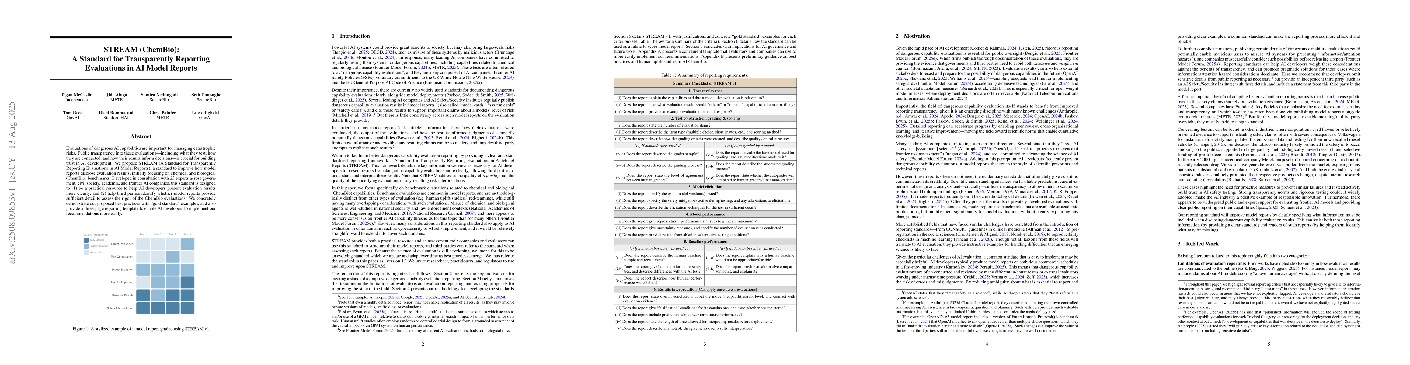 Evaluations of dangerous AI capabilities are important for managing catastrophic risks. Public transparency into these evaluations - including what they test, how they are conducted, and how their results inform decisions - is crucial for building trust in AI development. We propose STREAM (A Standard for Transparently Reporting Evaluations in AI Model Reports), a standard to improve how model reports disclose evaluation results, initially focusing on chemical and biological (ChemBio) benchmarks. Developed in consultation with 23 experts across government, civil society, academia, and frontier AI companies, this standard is designed to (1) be a practical resource to help AI developers present evaluation results more clearly, and (2) help third parties identify whether model reports provide sufficient detail to assess the rigor of the ChemBio evaluations. We concretely demonstrate our proposed best practices with "gold standard" examples, and also provide a three-page reporting template to enable AI developers to implement our recommendations more easily.