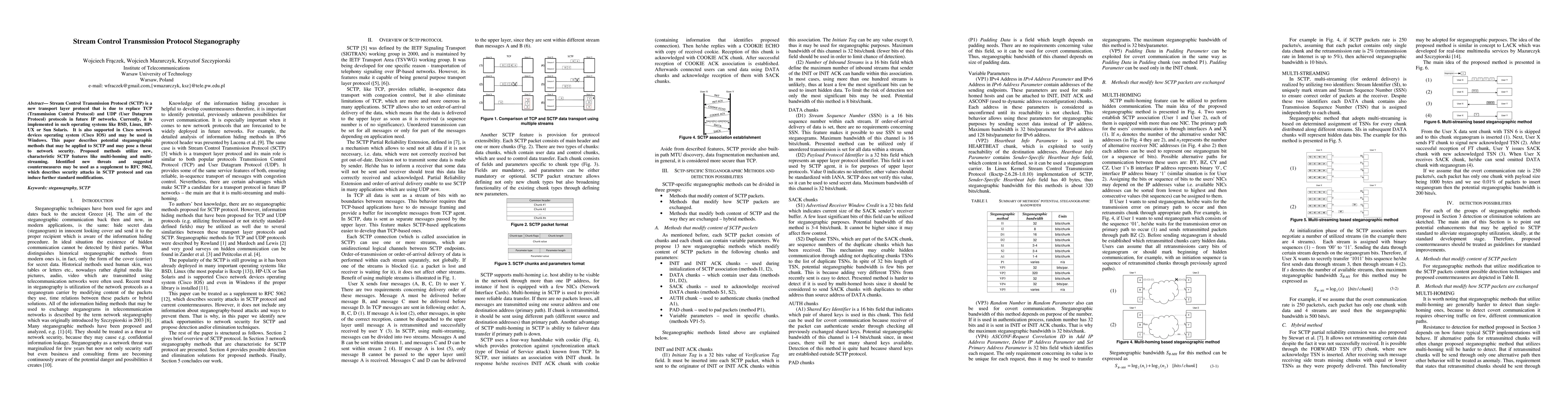 Stream Control Transmission Protocol (SCTP) is a new transport layer protocol that is due to replace TCP (Transmission Control Protocol) and UDP (User Datagram Protocol) protocols in future IP networks. Currently, it is implemented in such operating systems like BSD, Linux, HP-UX or Sun Solaris. It is also supported in Cisco network devices operating system (Cisco IOS) and may be used in Windows. This paper describes potential steganographic methods that may be applied to SCTP and may pose a threat to network security. Proposed methods utilize new, characteristic SCTP features like multi-homing and multistreaming. Identified new threats and suggested countermeasures may be used as a supplement to RFC 5062, which describes security attacks in SCTP protocol and can induce further standard modifications.