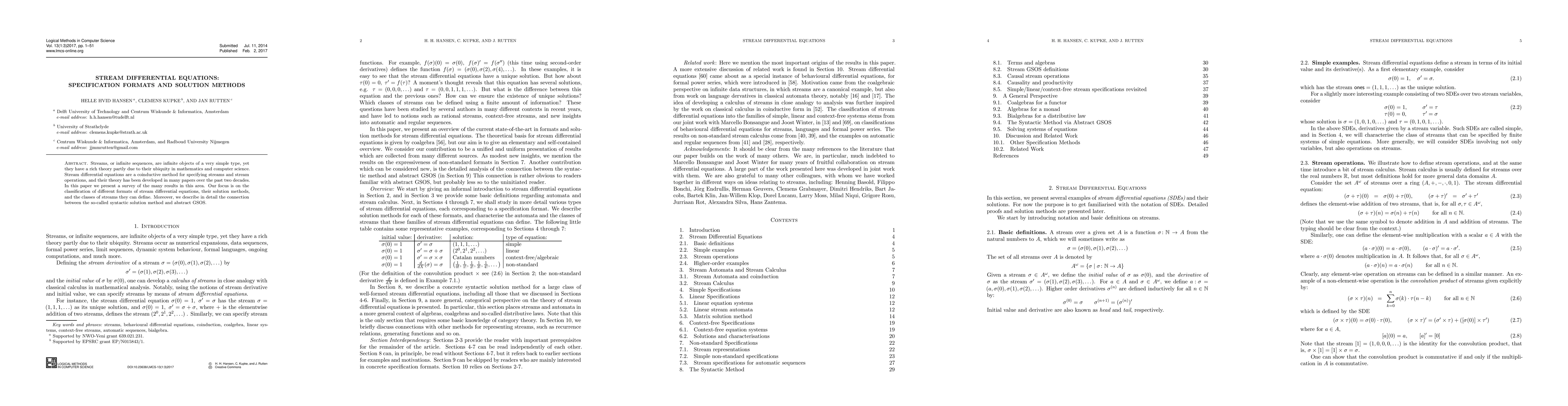 This paper surveys stream differential equations, a method for specifying infinite sequences, focusing on classification of formats, solution methods, and the types of streams they define.