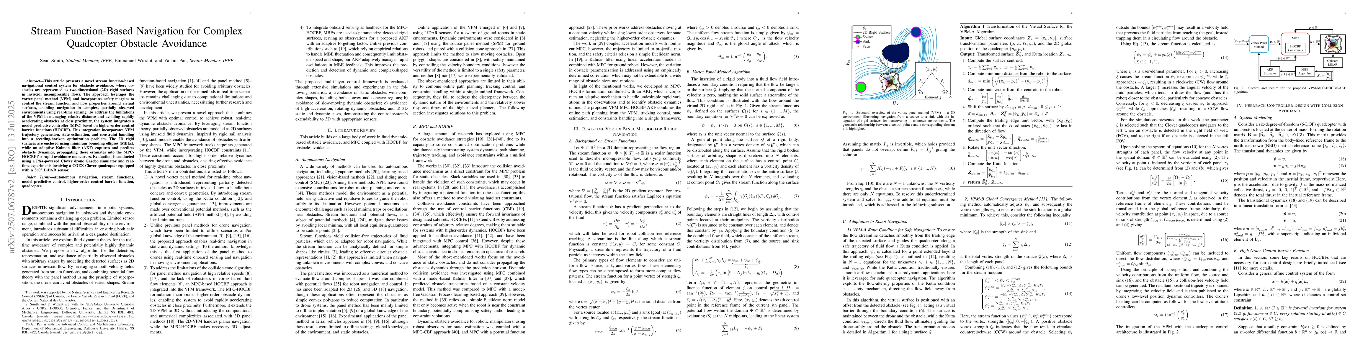 This article presents a novel stream function-based navigational control system for obstacle avoidance, where obstacles are represented as two-dimensional (2D) rigid surfaces in inviscid, incompressible flows. The approach leverages the vortex panel method (VPM) and incorporates safety margins to control the stream function and flow properties around virtual surfaces, enabling navigation in complex, partially observed environments using real-time sensing. To address the limitations of the VPM in managing relative distance and avoiding rapidly accelerating obstacles at close proximity, the system integrates a model predictive controller (MPC) based on higher-order control barrier functions (HOCBF). This integration incorporates VPM trajectory generation, state estimation, and constraint handling into a receding-horizon optimization problem. The 2D rigid surfaces are enclosed using minimum bounding ellipses (MBEs), while an adaptive Kalman filter (AKF) captures and predicts obstacle dynamics, propagating these estimates into the MPC-HOCBF for rapid avoidance maneuvers. Evaluation is conducted using a PX4-powered Clover drone Gazebo simulator and real-time experiments involving a COEX Clover quadcopter equipped with a 360 degree LiDAR sensor.