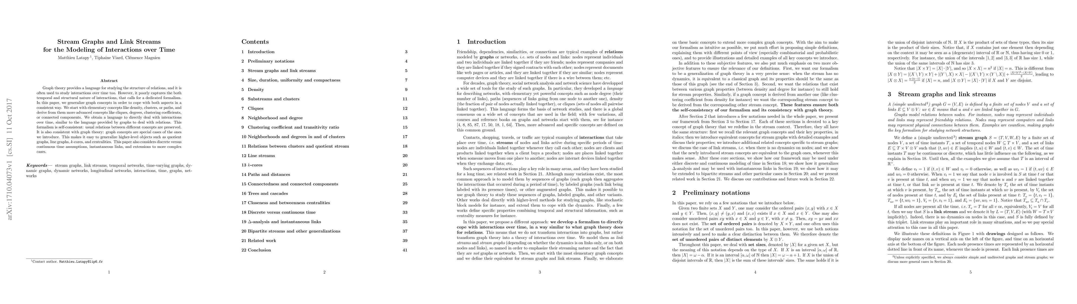 Graph theory provides a language for studying the structure of relations, and it is often used to study interactions over time too. However, it poorly captures the both temporal and structural nature of interactions, that calls for a dedicated formalism. In this paper, we generalize graph concepts in order to cope with both aspects in a consistent way. We start with elementary concepts like density, clusters, or paths, and derive from them more advanced concepts like cliques, degrees, clustering coefficients, or connected components. We obtain a language to directly deal with interactions over time, similar to the language provided by graphs to deal with relations. This formalism is self-consistent: usual relations between different concepts are preserved. It is also consistent with graph theory: graph concepts are special cases of the ones we introduce. This makes it easy to generalize higher-level objects such as quotient graphs, line graphs, k-cores, and centralities. This paper also considers discrete versus continuous time assumptions, instantaneous links, and extensions to more complex cases.