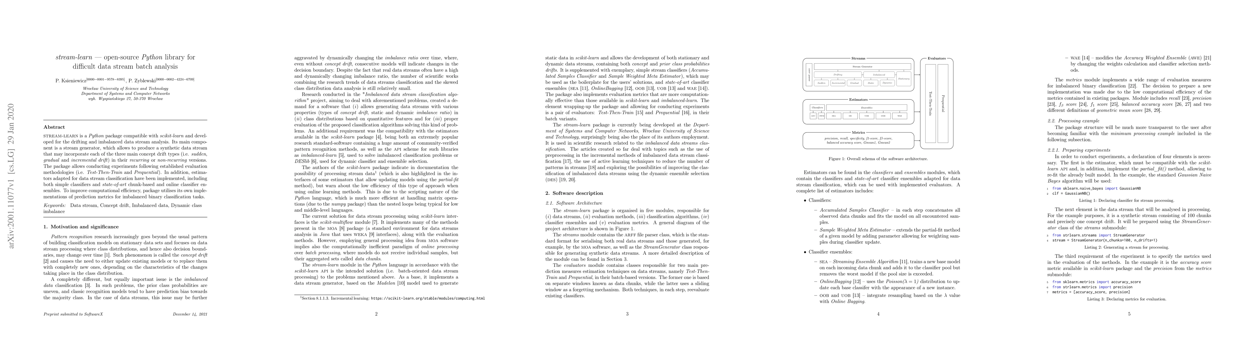 **Summary:** stream-learn is a Python library for analyzing drifting and imbalanced data streams, featuring a synthetic data stream generator for various concept drift types and evaluation methodologies, along with adapted classifiers and efficient prediction metrics for binary classification tasks.