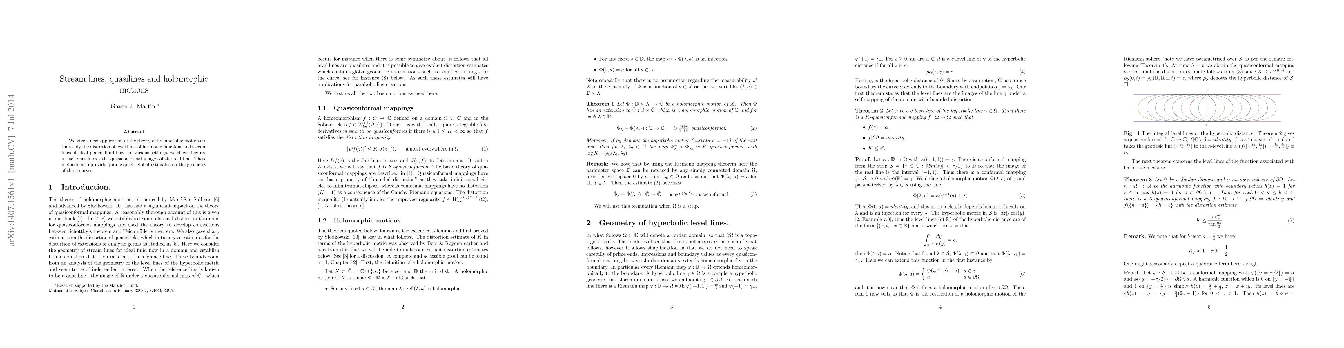 This paper applies the theory of holomorphic motions to demonstrate that level lines of harmonic functions and streamlines of ideal planar fluid flow are quasilines, offering explicit global geometric estimates on these curves.