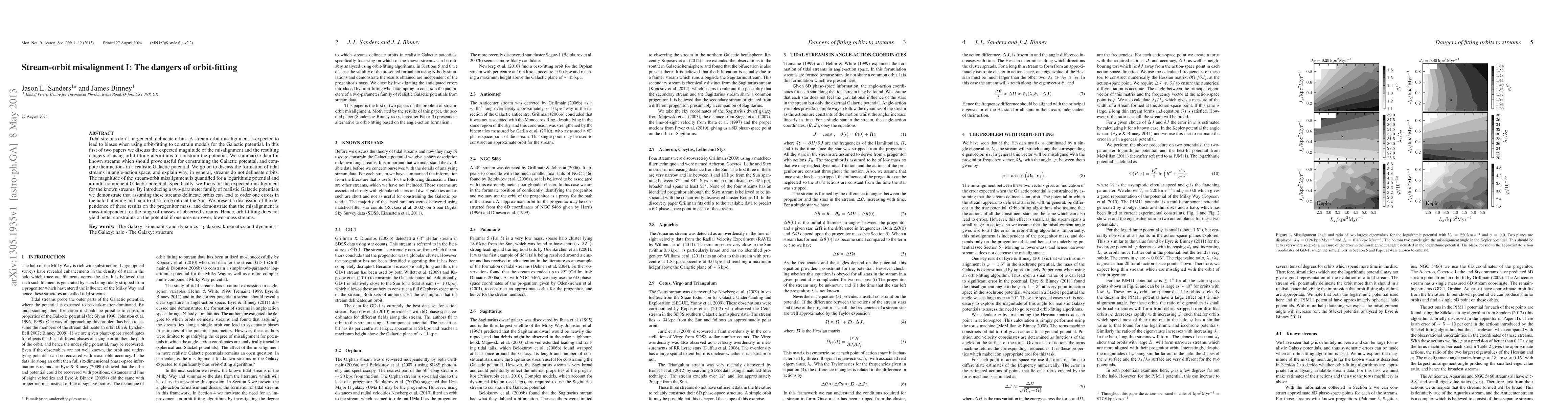 Tidal streams don't, in general, delineate orbits. A stream-orbit misalignment is expected to lead to biases when using orbit-fitting to constrain models for the Galactic potential. In this first of two papers we discuss the expected magnitude of the misalignment and the resulting dangers of using orbit-fitting algorithms to constrain the potential. We summarize data for known streams which should prove useful for constraining the Galactic potential, and compute their actions in a realistic Galactic potential. We go on to discuss the formation of tidal streams in angle-action space, and explain why, in general, streams do not delineate orbits. The magnitude of the stream-orbit misalignment is quantified for a logarithmic potential and a multi-component Galactic potential. Specifically, we focus on the expected misalignment for the known streams. By introducing a two-parameter family of realistic Galactic potentials we demonstrate that assuming these streams delineate orbits can lead to order one errors in the halo flattening and halo-to-disc force ratio at the Sun. We present a discussion of the dependence of these results on the progenitor mass, and demonstrate that the misalignment is mass-independent for the range of masses of observed streams. Hence, orbit-fitting does not yield better constraints on the potential if one uses narrower, lower-mass streams.