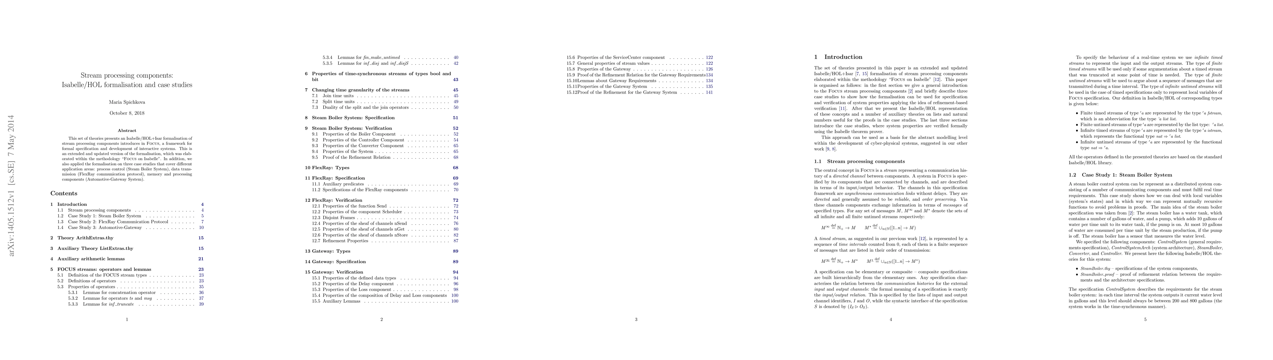 This paper presents a formalisation of stream processing components using Isabelle/HOL+Isar, which was applied to three case studies in process control, data transmission, and memory/processing systems.