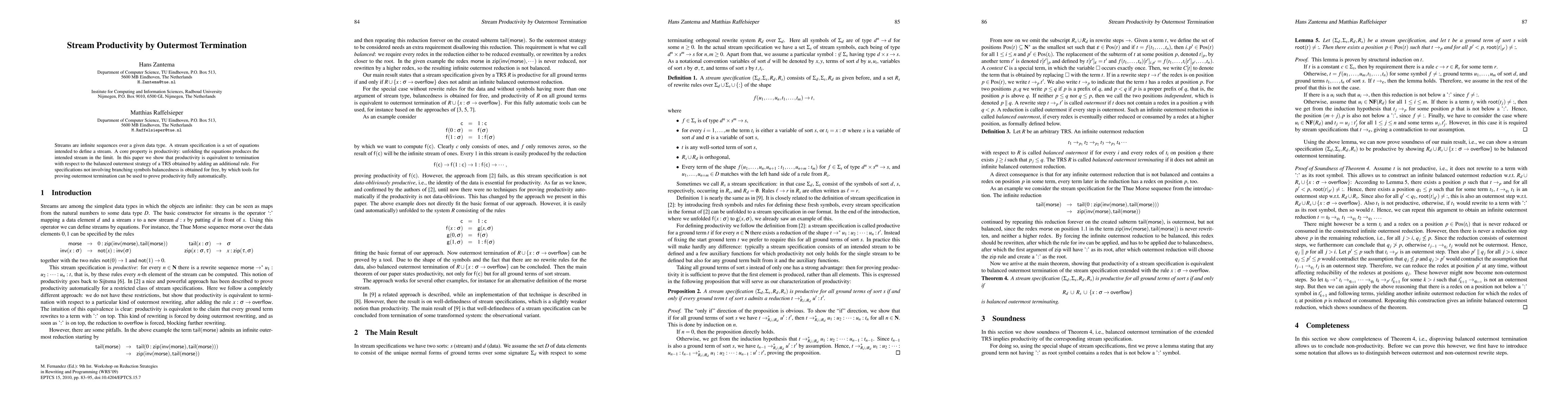 Streams are infinite sequences over a given data type. A stream specification is a set of equations intended to define a stream. A core property is productivity: unfolding the equations produces the intended stream in the limit. In this paper we show that productivity is equivalent to termination with respect to the balanced outermost strategy of a TRS obtained by adding an additional rule. For specifications not involving branching symbols balancedness is obtained for free, by which tools for proving outermost termination can be used to prove productivity fully automatically.