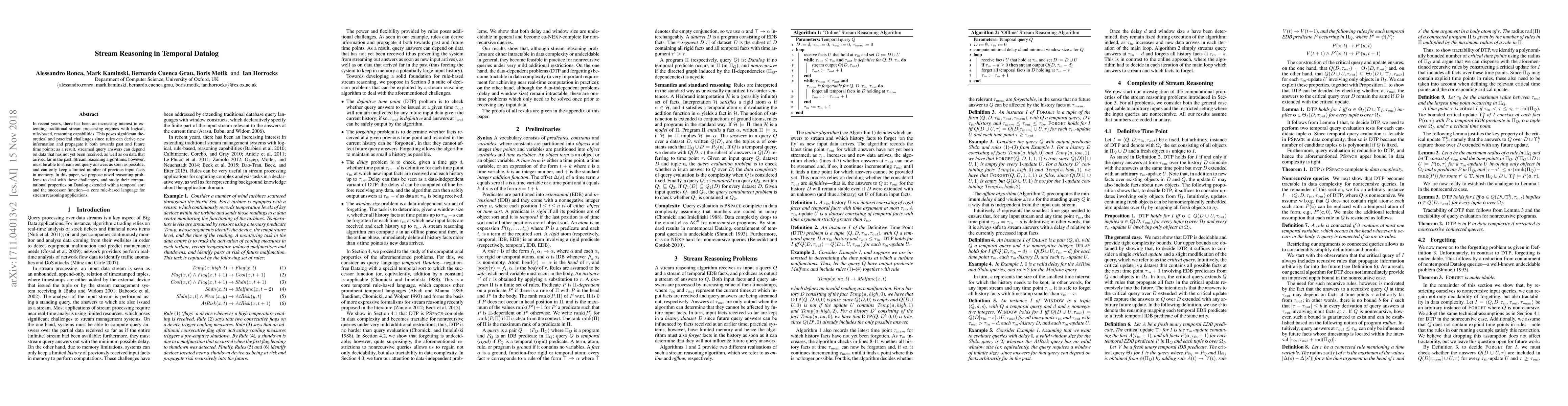 In recent years, there has been an increasing interest in extending traditional stream processing engines with logical, rule-based, reasoning capabilities. This poses significant theoretical and practical challenges since rules can derive new information and propagate it both towards past and future time points; as a result, streamed query answers can depend on data that has not yet been received, as well as on data that arrived far in the past. Stream reasoning algorithms, however, must be able to stream out query answers as soon as possible, and can only keep a limited number of previous input facts in memory. In this paper, we propose novel reasoning problems to deal with these challenges, and study their computational properties on Datalog extended with a temporal sort and the successor function (a core rule-based language for stream reasoning applications).