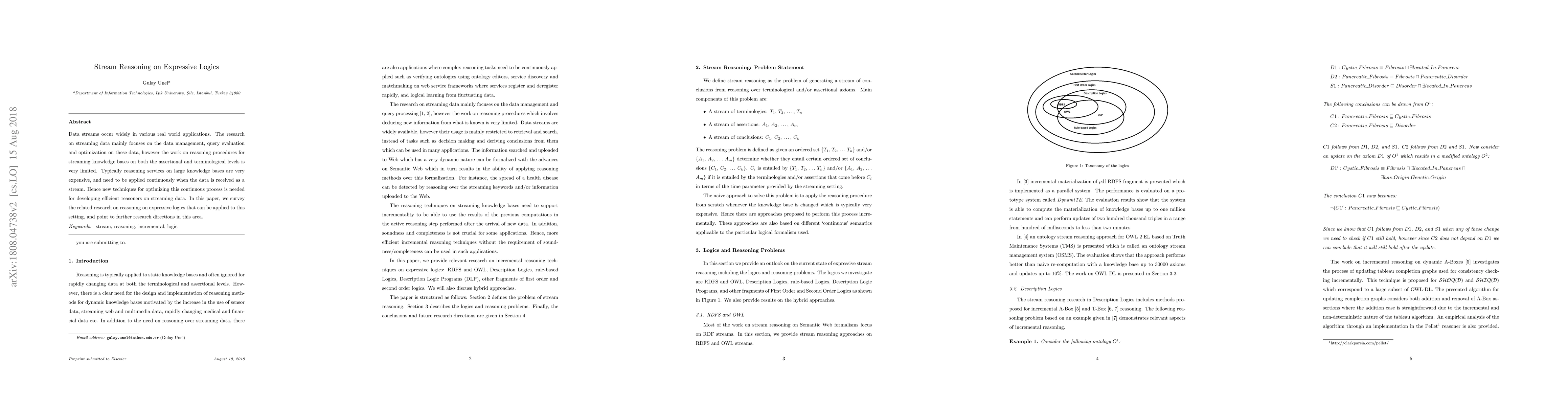 Data streams occur widely in various real world applications. The research on streaming data mainly focuses on the data management, query evaluation and optimization on these data, however the work on reasoning procedures for streaming knowledge bases on both the assertional and terminological levels is very limited. Typically reasoning services on large knowledge bases are very expensive, and need to be applied continuously when the data is received as a stream. Hence new techniques for optimizing this continuous process is needed for developing efficient reasoners on streaming data. In this paper, we survey the related research on reasoning on expressive logics that can be applied to this setting, and point to further research directions in this area.