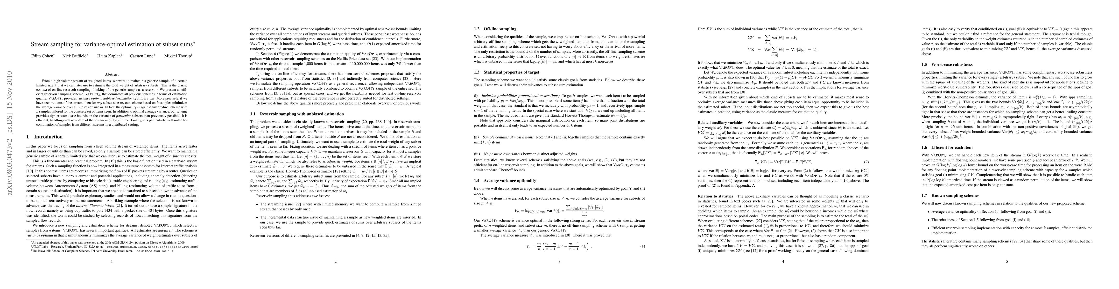 This paper introduces an efficient reservoir sampling scheme, $\varoptk$, for variance-optimal estimation of subset sums from high-volume data streams. $\varoptk$ minimizes the average variance for any subset size, providing optimal unbiased estimation against any off-line scheme, while maintaining efficient $O(\log k)$ time complexity per item.