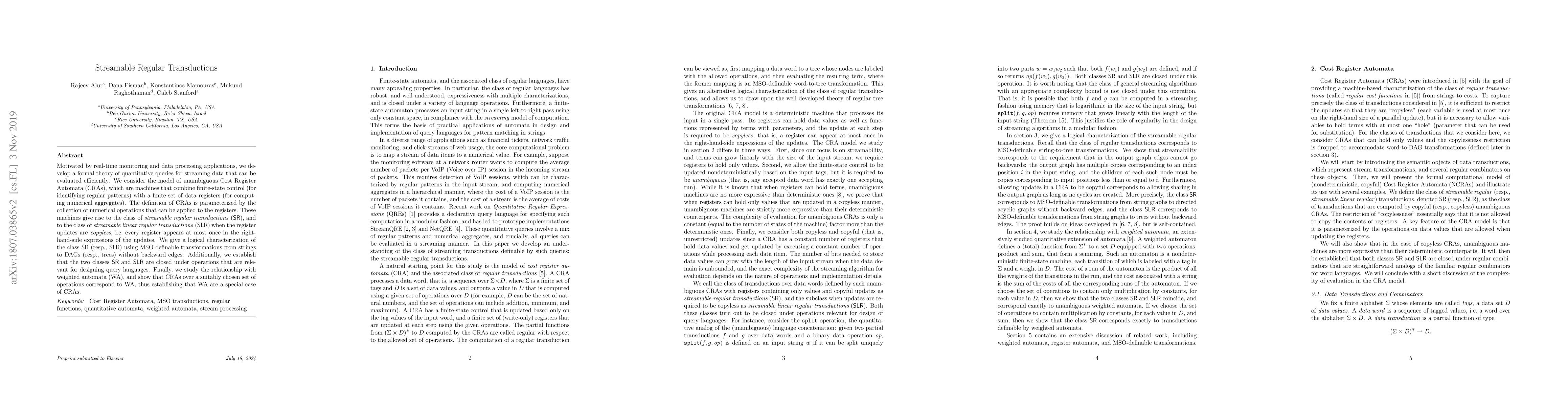 This paper develops a formal theory for efficient evaluation of quantitative queries on streaming data using unambiguous Cost Register Automata (CRAs), which combine finite-state control with numerical registers. It introduces streamable regular transductions (SR) and their copyless variant (SLR), providing logical characterizations and establishing their closure under query language operations, and showing their equivalence to weighted automata.