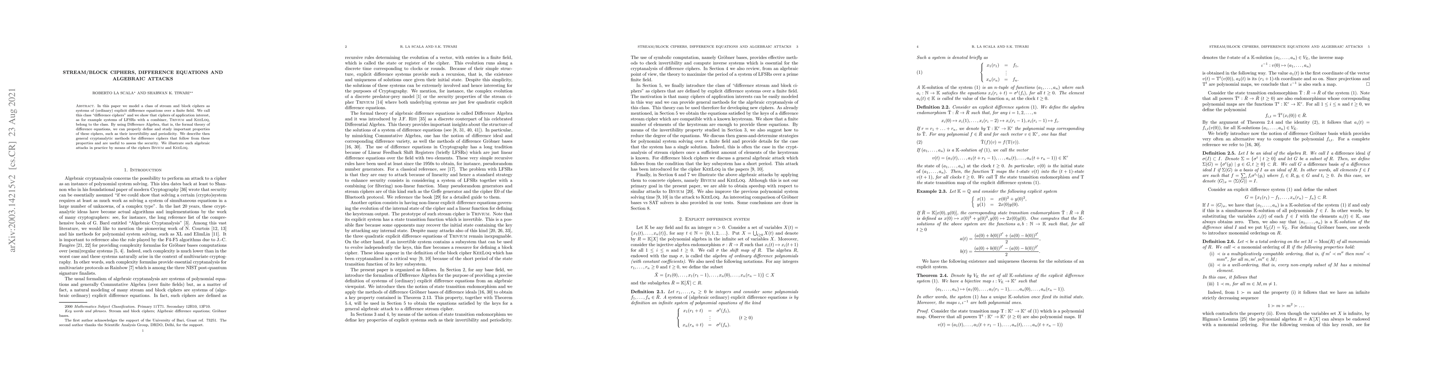 This paper models stream and block ciphers as systems of explicit difference equations over finite fields, termed "difference ciphers," including notable examples like LFSR-based systems, Trivium, and Keeloq. It employs Difference Algebra to analyze their properties and proposes algebraic attacks to assess their security, demonstrating these methods with ciphers Bivium and Keeloq.