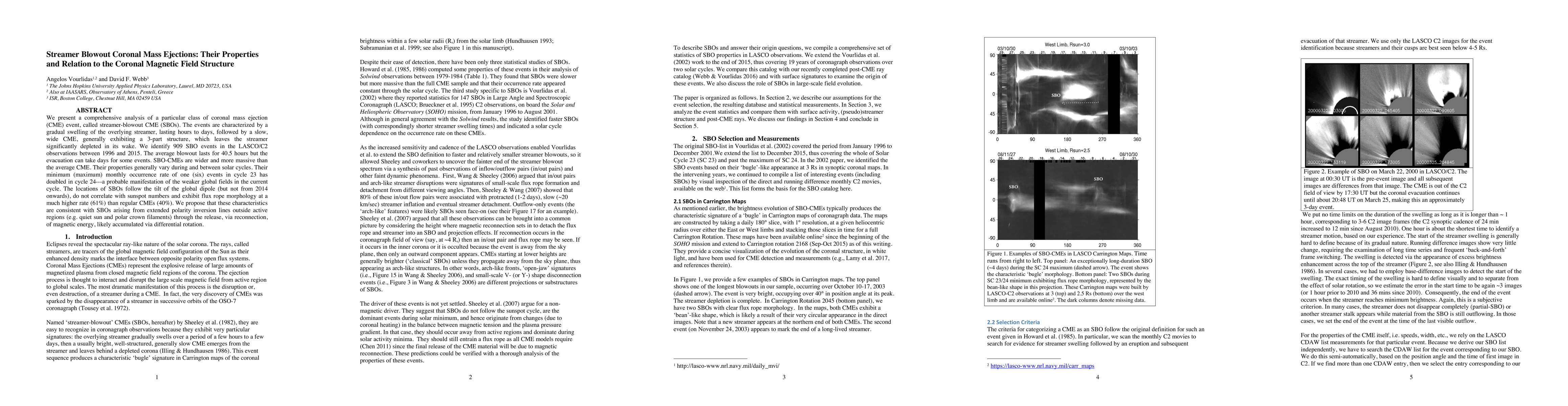 This study analyzes streamer-blowout coronal mass ejections (SBOs), identifying 909 such events from 1996 to 2015. SBO-CMEs are wider, more massive, and occur less frequently in cycle 24 compared to 23. They originate from extended polarity inversion lines outside active regions, released via magnetic reconnection, suggesting weaker global fields in the current solar cycle.