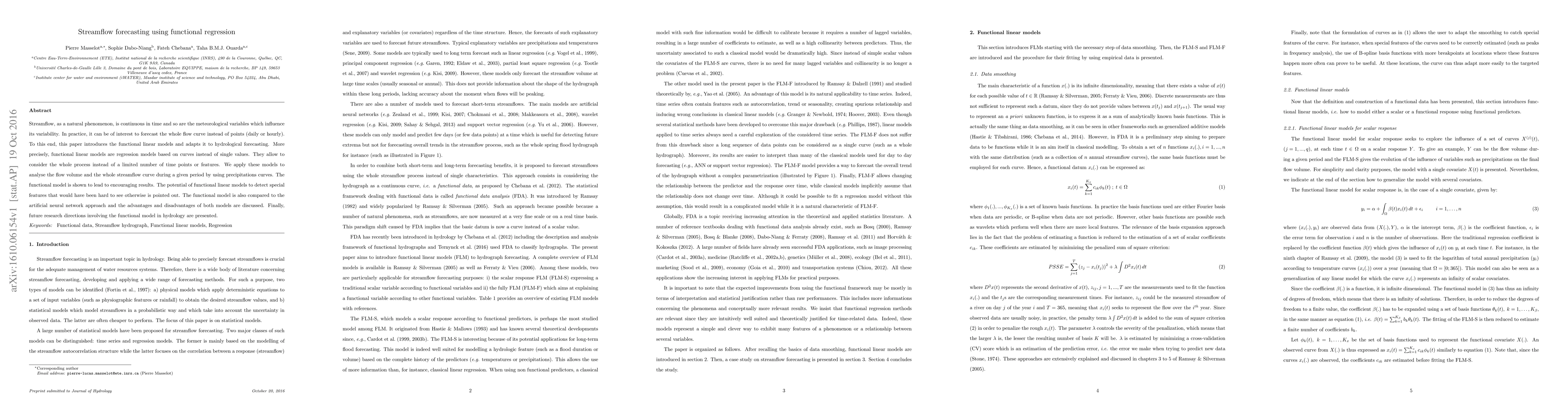 Streamflow, as a natural phenomenon, is continuous in time and so are the meteorological variables which influence its variability. In practice, it can be of interest to forecast the whole flow curve instead of points (daily or hourly). To this end, this paper introduces the functional linear models and adapts it to hydrological forecasting. More precisely, functional linear models are regression models based on curves instead of single values. They allow to consider the whole process instead of a limited number of time points or features. We apply these models to analyse the flow volume and the whole streamflow curve during a given period by using precipitations curves. The functional model is shown to lead to encouraging results. The potential of functional linear models to detect special features that would have been hard to see otherwise is pointed out. The functional model is also compared to the artificial neural network approach and the advantages and disadvantages of both models are discussed. Finally, future research directions involving the functional model in hydrology are presented.
