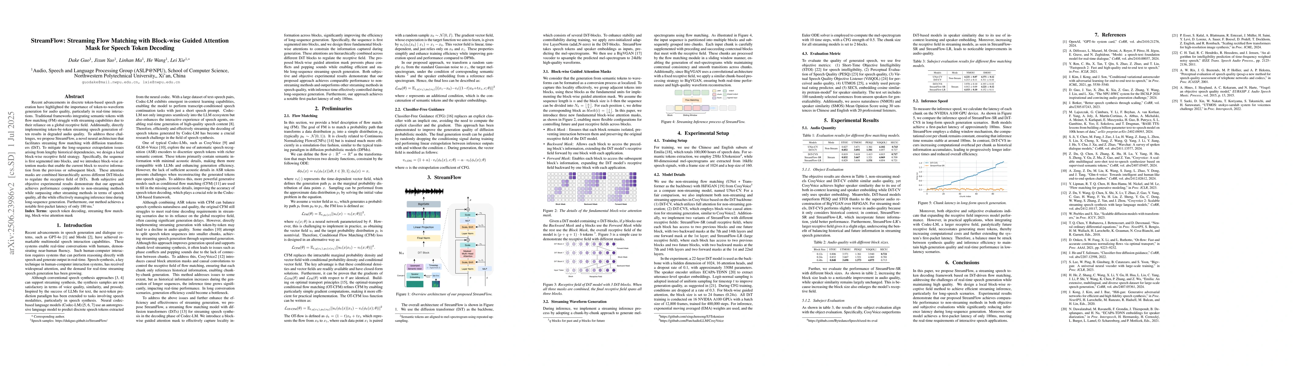 The research introduces StreamFlow, a neural architecture for streaming flow matching using diffusion transformers (DiT). It addresses the limitations of traditional frameworks in real-time speech generation by segmenting sequences into blocks and employing block-wise attention masks. This method ensures the current block receives information from the previous or subsequent block, regulating receptive fields and improving speech quality with low latency of 180 ms, outperforming other streaming methods.