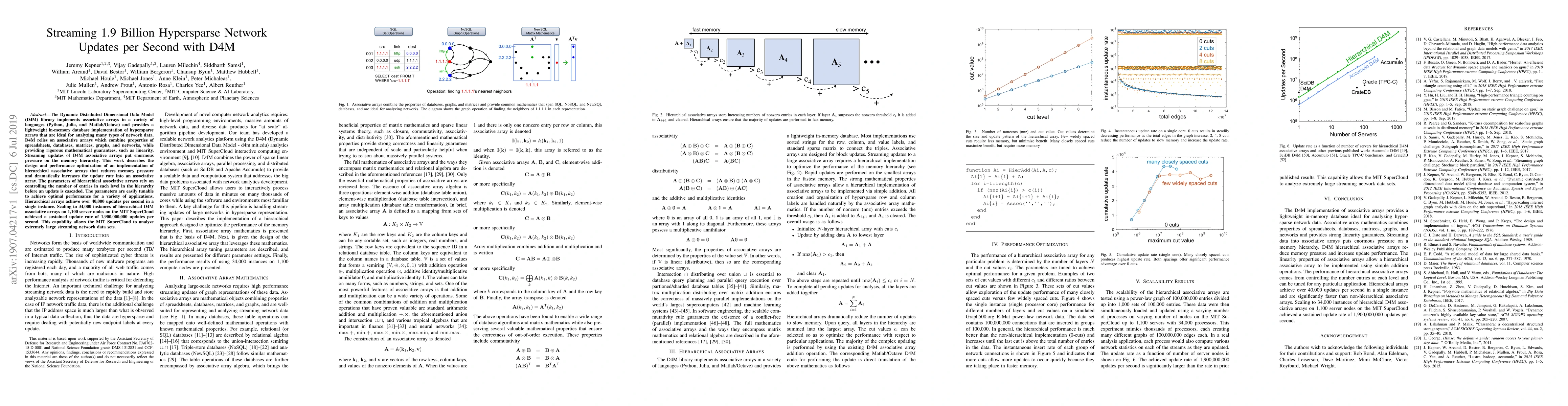 The D4M library enables high-performance updates of hypersparse associative arrays, achieving 1.9 billion updates per second across 34,000 instances on 1,100 server nodes, optimizing memory hierarchy to handle large streaming network data.