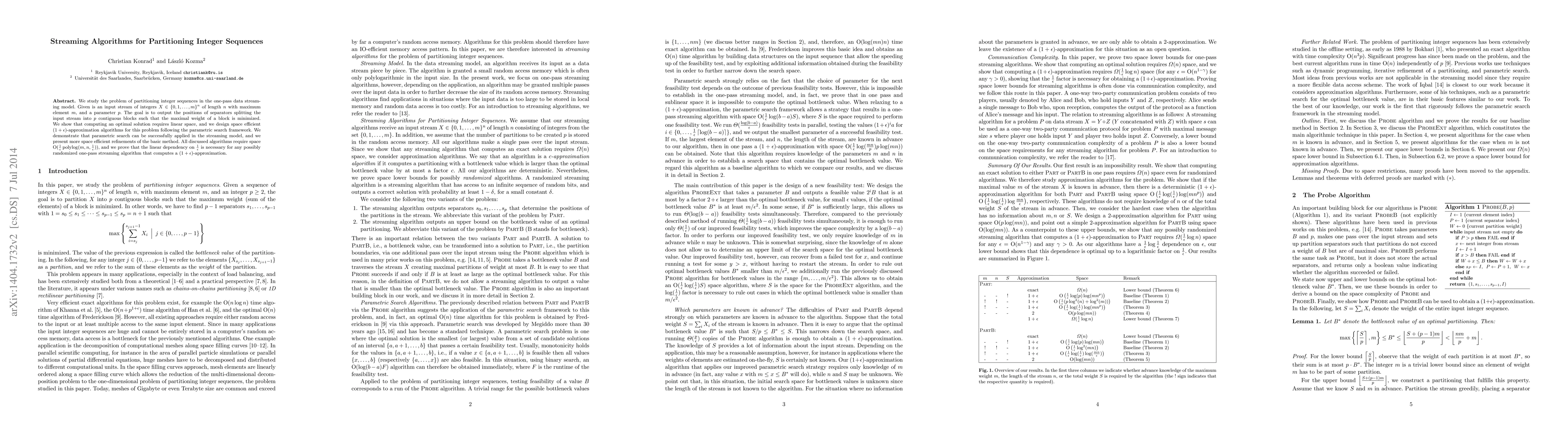 This paper explores the problem of partitioning integer sequences in a one-pass data streaming model, aiming to minimize the maximum weight of blocks by outputting separator positions. It presents space-efficient $(1+\epsilon)$-approximation algorithms and proves that linear space is required for optimal solutions, while the proposed algorithms require space $O( \frac{1}{\epsilon} \mathrm{polylog} (m,n,\frac{1}{\epsilon}))$.