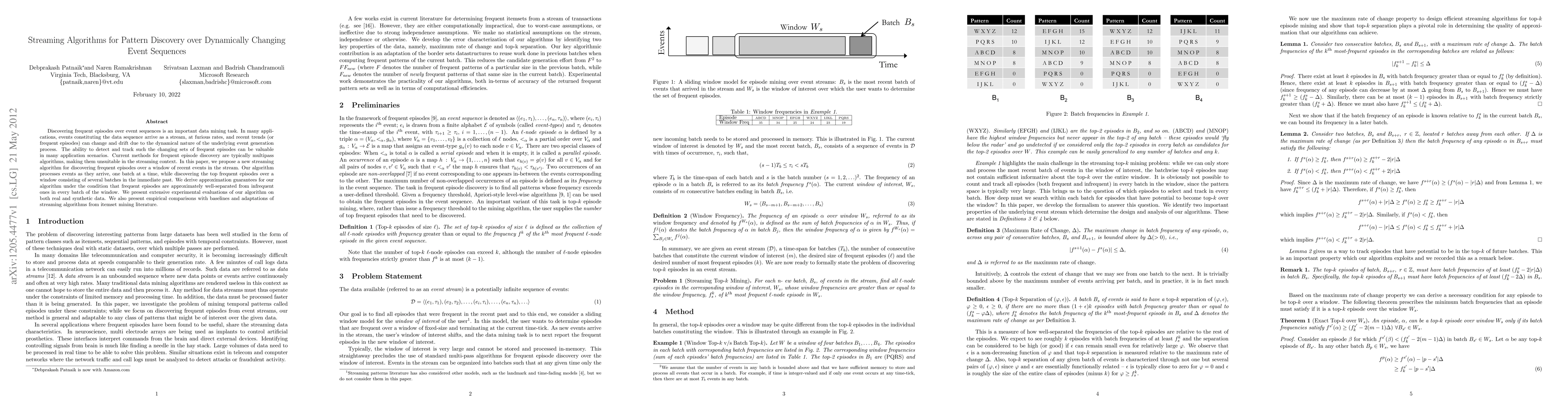 This paper proposes a new streaming algorithm for identifying frequent episodes in dynamically changing event sequences. It processes events in batches and discovers top frequent episodes over a window of recent batches, providing approximation guarantees under certain conditions. Experimental evaluations show its effectiveness compared to existing multipass algorithms.