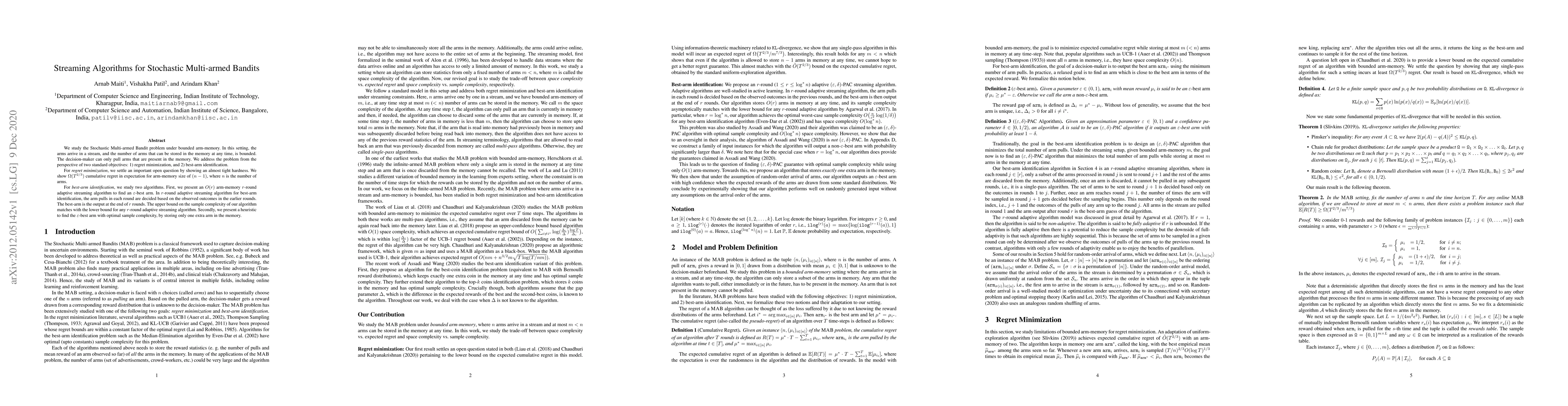 We study the Stochastic Multi-armed Bandit problem under bounded arm-memory. In this setting, the arms arrive in a stream, and the number of arms that can be stored in the memory at any time, is bounded. The decision-maker can only pull arms that are present in the memory. We address the problem from the perspective of two standard objectives: 1) regret minimization, and 2) best-arm identification. For regret minimization, we settle an important open question by showing an almost tight hardness. We show {\Omega}(T^{2/3}) cumulative regret in expectation for arm-memory size of (n-1), where n is the number of arms. For best-arm identification, we study two algorithms. First, we present an O(r) arm-memory r-round adaptive streaming algorithm to find an {\epsilon}-best arm. In r-round adaptive streaming algorithm for best-arm identification, the arm pulls in each round are decided based on the observed outcomes in the earlier rounds. The best-arm is the output at the end of r rounds. The upper bound on the sample complexity of our algorithm matches with the lower bound for any r-round adaptive streaming algorithm. Secondly, we present a heuristic to find the {\epsilon}-best arm with optimal sample complexity, by storing only one extra arm in the memory.