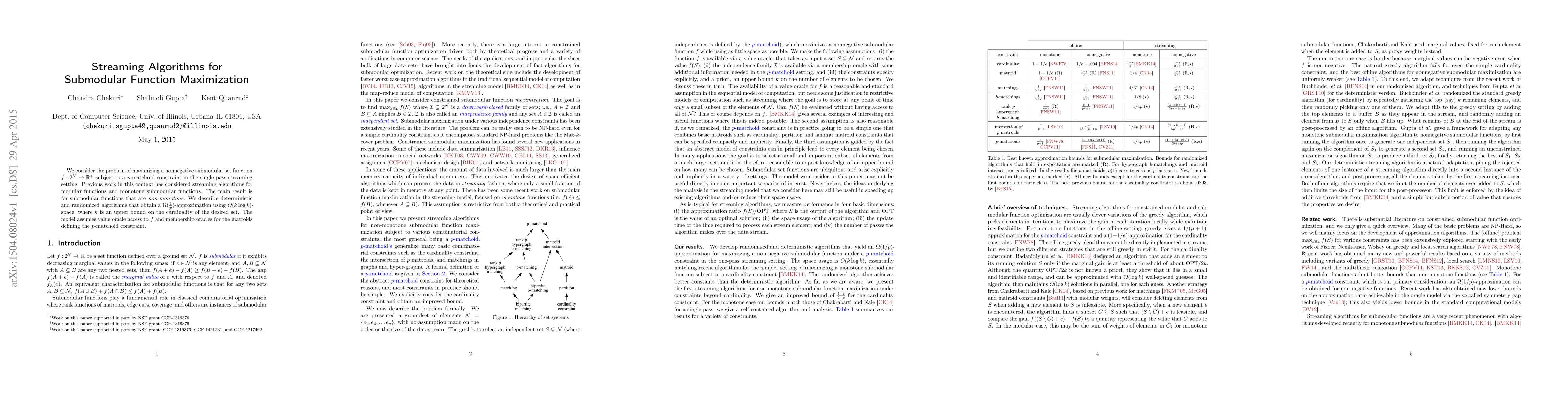 The paper presents streaming algorithms for maximizing nonnegative submodular functions under a p-matchoid constraint in the single-pass streaming setting, focusing on non-monotone submodular functions.
