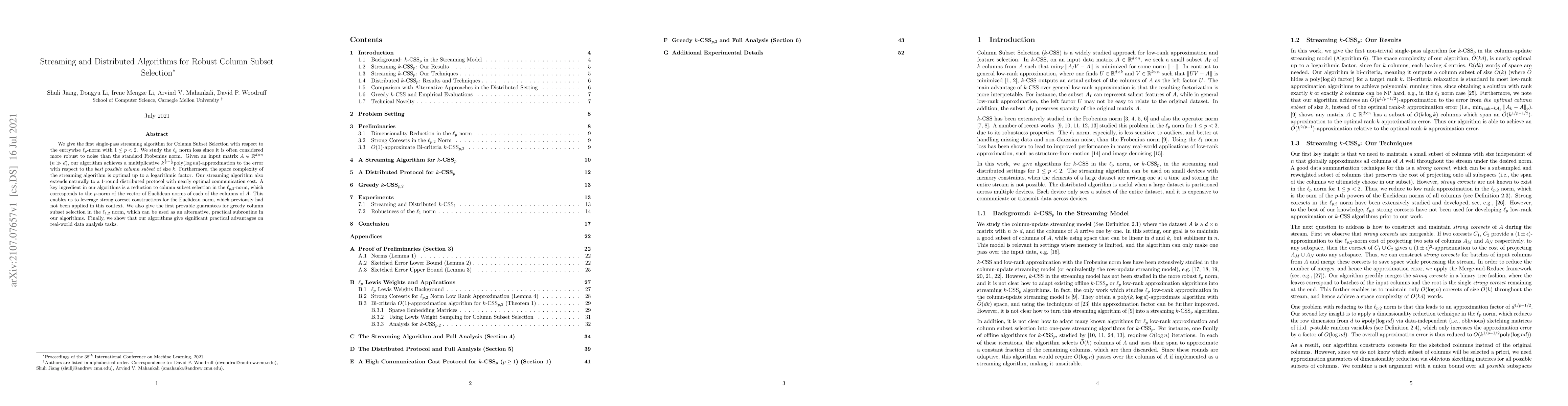 This paper presents the first single-pass streaming algorithm for robust column subset selection using the $\ell_p$-norm ($1 \leq p < 2$), achieving a near-optimal approximation and space complexity. It extends to a distributed protocol with minimal communication cost, leveraging coreset constructions for Euclidean norms.