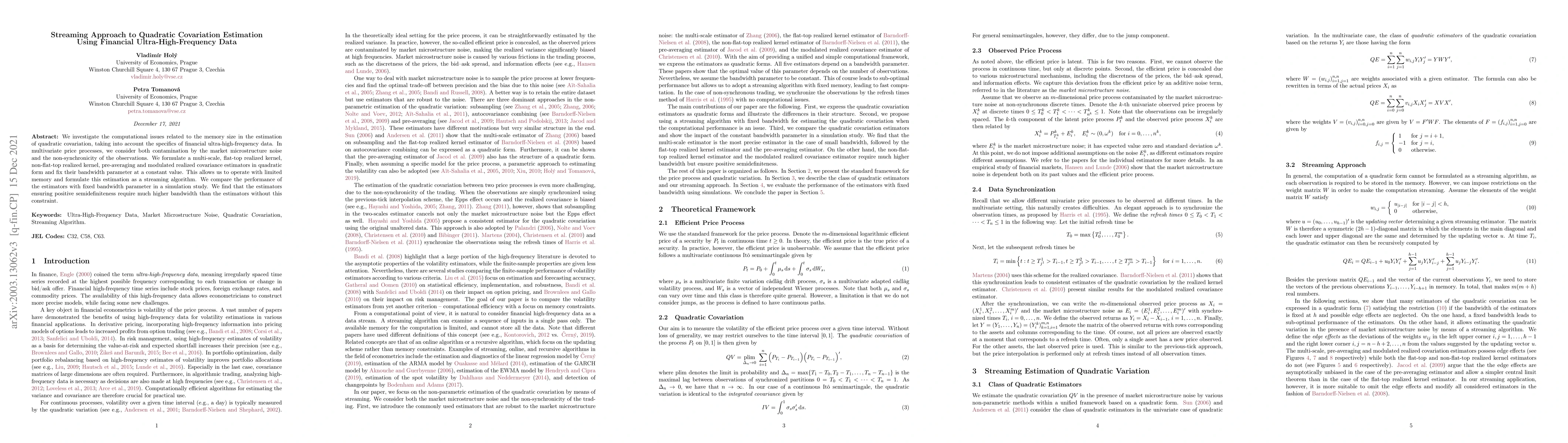 We investigate the computational issues related to the memory size in the estimation of quadratic covariation, taking into account the specifics of financial ultra-high-frequency data. In multivariate price processes, we consider both contamination by the market microstructure noise and the non-synchronicity of the observations. We formulate a multi-scale, flat-top realized kernel, non-flat-top realized kernel, pre-averaging and modulated realized covariance estimators in quadratic form and fix their bandwidth parameter at a constant value. This allows us to operate with limited memory and formulate this estimation as a streaming algorithm. We compare the performance of the estimators with fixed bandwidth parameter in a simulation study. We find that the estimators ensuring positive semidefiniteness require much higher bandwidth than the estimators without this constraint.