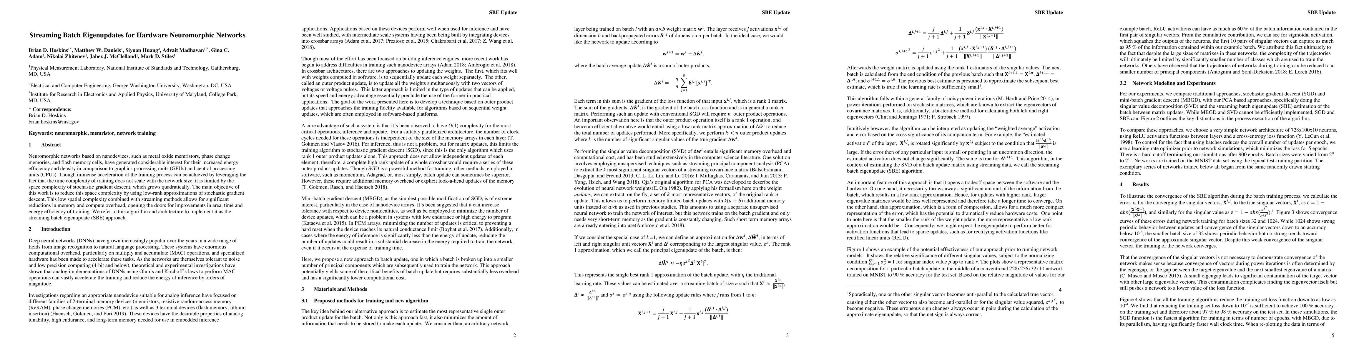 Neuromorphic networks based on nanodevices, such as metal oxide memristors, phase change memories, and flash memory cells, have generated considerable interest for their increased energy efficiency and density in comparison to graphics processing units (GPUs) and central processing units (CPUs). Though immense acceleration of the training process can be achieved by leveraging the fact that the time complexity of training does not scale with the network size, it is limited by the space complexity of stochastic gradient descent, which grows quadratically. The main objective of this work is to reduce this space complexity by using low-rank approximations of stochastic gradient descent. This low spatial complexity combined with streaming methods allows for significant reductions in memory and compute overhead, opening the doors for improvements in area, time and energy efficiency of training. We refer to this algorithm and architecture to implement it as the streaming batch eigenupdate (SBE) approach.
