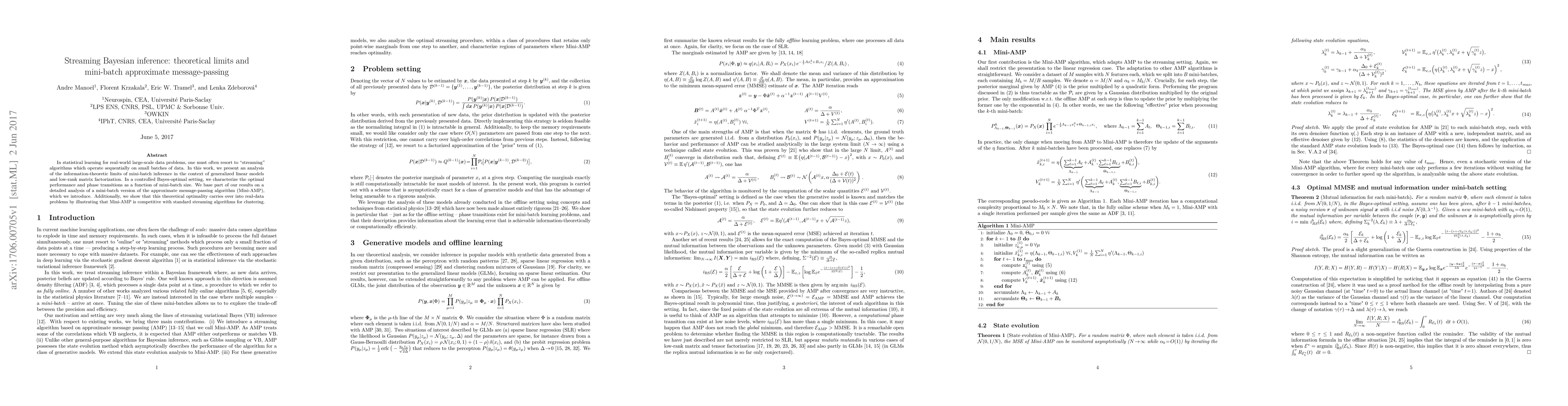 In statistical learning for real-world large-scale data problems, one must often resort to "streaming" algorithms which operate sequentially on small batches of data. In this work, we present an analysis of the information-theoretic limits of mini-batch inference in the context of generalized linear models and low-rank matrix factorization. In a controlled Bayes-optimal setting, we characterize the optimal performance and phase transitions as a function of mini-batch size. We base part of our results on a detailed analysis of a mini-batch version of the approximate message-passing algorithm (Mini-AMP), which we introduce. Additionally, we show that this theoretical optimality carries over into real-data problems by illustrating that Mini-AMP is competitive with standard streaming algorithms for clustering.