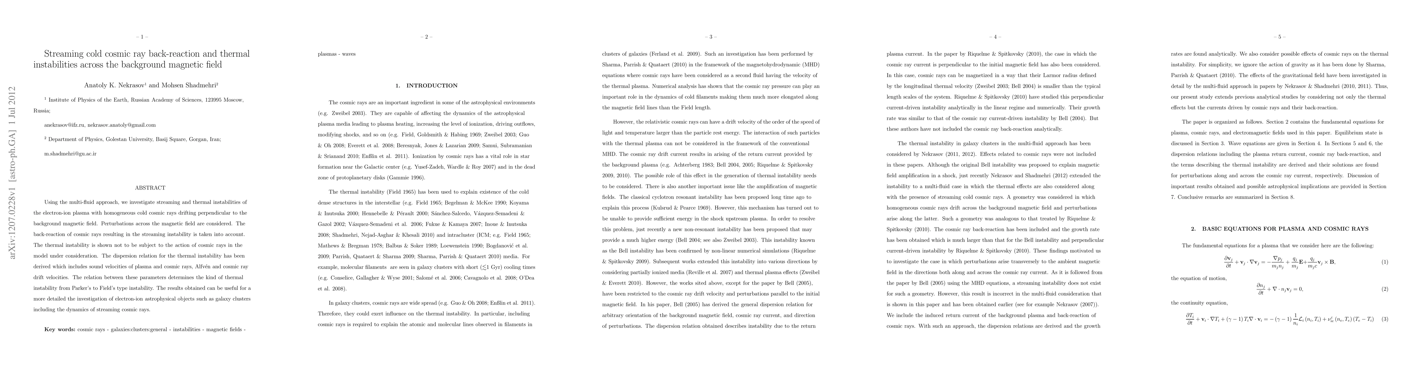 This paper explores the streaming and thermal instabilities in an electron-ion plasma with cold cosmic rays drifting perpendicular to a magnetic field, using a multi-fluid approach. It finds that cosmic rays influence the streaming instability but not the thermal instability, deriving a dispersion relation that includes various velocities to determine the type of thermal instability.