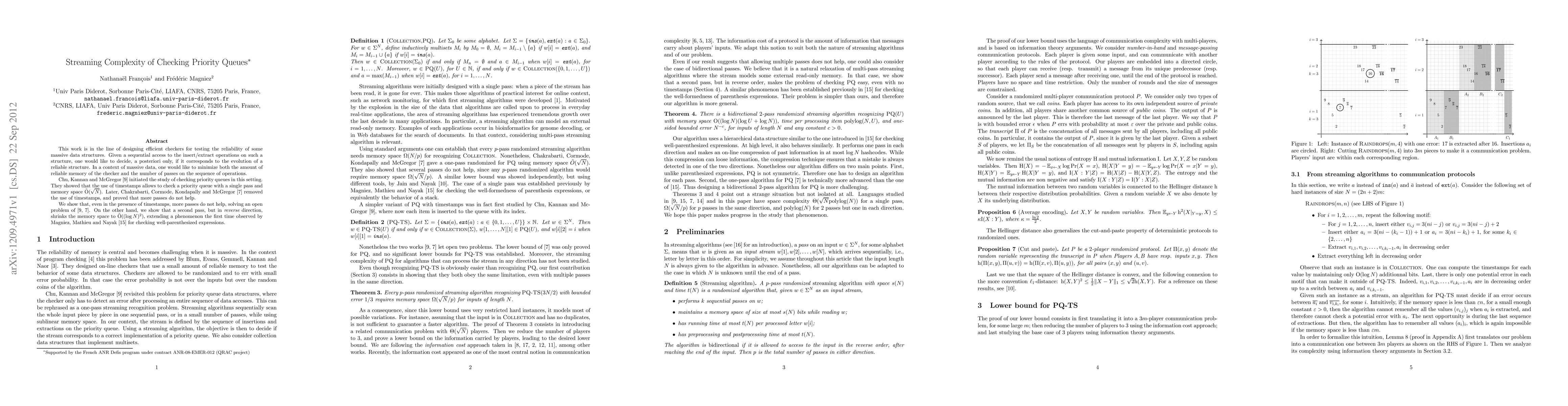 This work is in the line of designing efficient checkers for testing the reliability of some massive data structures. Given a sequential access to the insert/extract operations on such a structure, one would like to decide, a posteriori only, if it corresponds to the evolution of a reliable structure. In a context of massive data, one would like to minimize both the amount of reliable memory of the checker and the number of passes on the sequence of operations. Chu, Kannan and McGregor initiated the study of checking priority queues in this setting. They showed that use of timestamps allows to check a priority queue with a single pass and memory space O(N^(1/2)), up to a polylogarithmic factor. Later, Chakrabarti, Cormode, Kondapally and McGregor removed the use of timestamps, and proved that more passes do not help. We show that, even in the presence of timestamps, more passes do not help, solving a previously open problem. On the other hand, we show that a second pass, but in reverse direction, shrinks the memory space to O((log N)^2), extending a phenomenon the first time observed by Magniez, Mathieu and Nayak for checking well-parenthesized expressions.