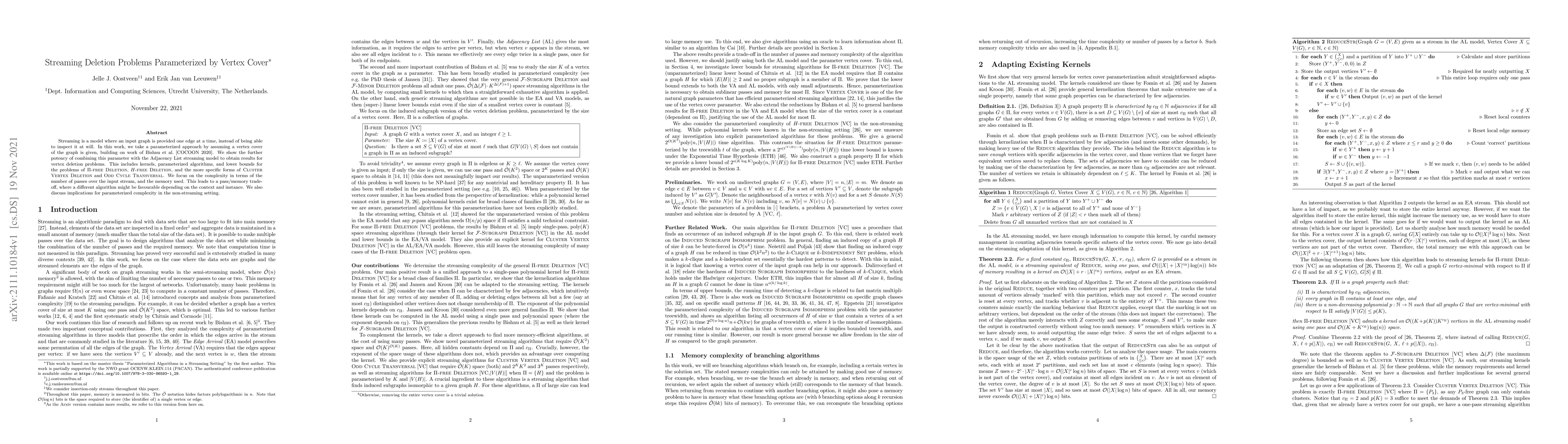 This paper investigates streaming algorithms for vertex deletion problems, parameterized by a given vertex cover, within the Adjacency List streaming model. It presents kernels, parameterized algorithms, and lower bounds for Pi-free Deletion, H-free Deletion, Cluster Vertex Deletion, and Odd Cycle Transversal, highlighting pass/memory trade-offs and implications for parameterized complexity.