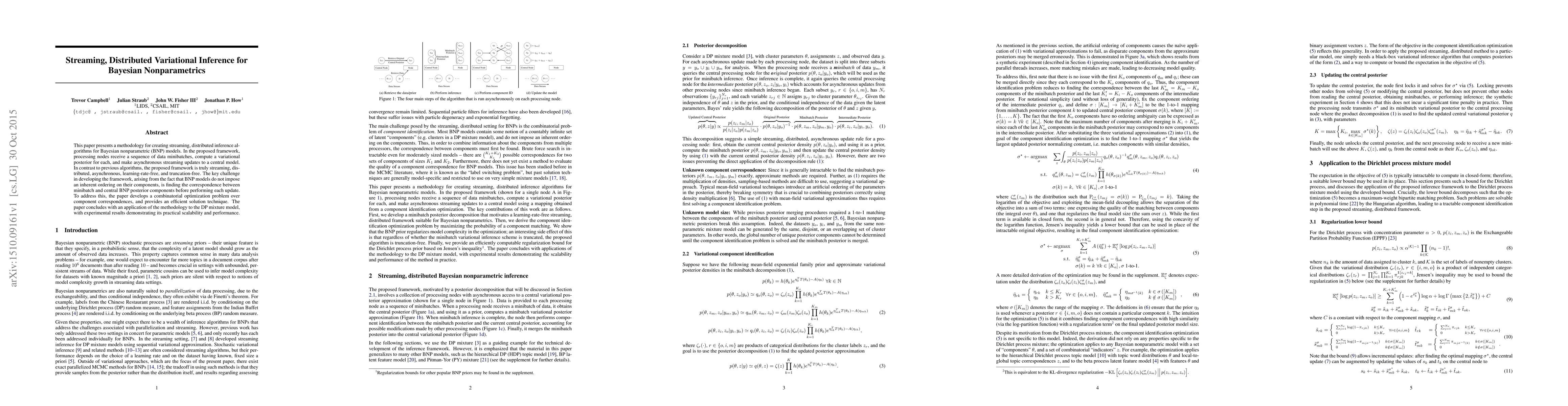 This paper introduces a novel streaming, distributed inference framework for Bayesian nonparametric models, enabling asynchronous updates without learning rates or truncations. The key innovation is a solution to the correspondence problem between minibatches and central posterior components, demonstrated through scalable performance in DP mixture models.
