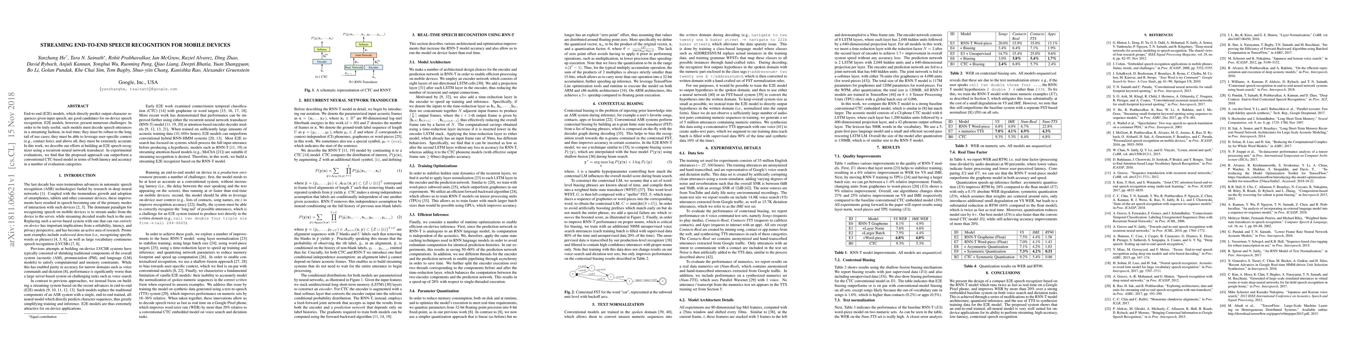 This paper presents an end-to-end (E2E) speech recognition model using a recurrent neural network transducer for mobile devices, achieving real-time streaming capabilities and outperforming traditional CTC-based models in both latency and accuracy.