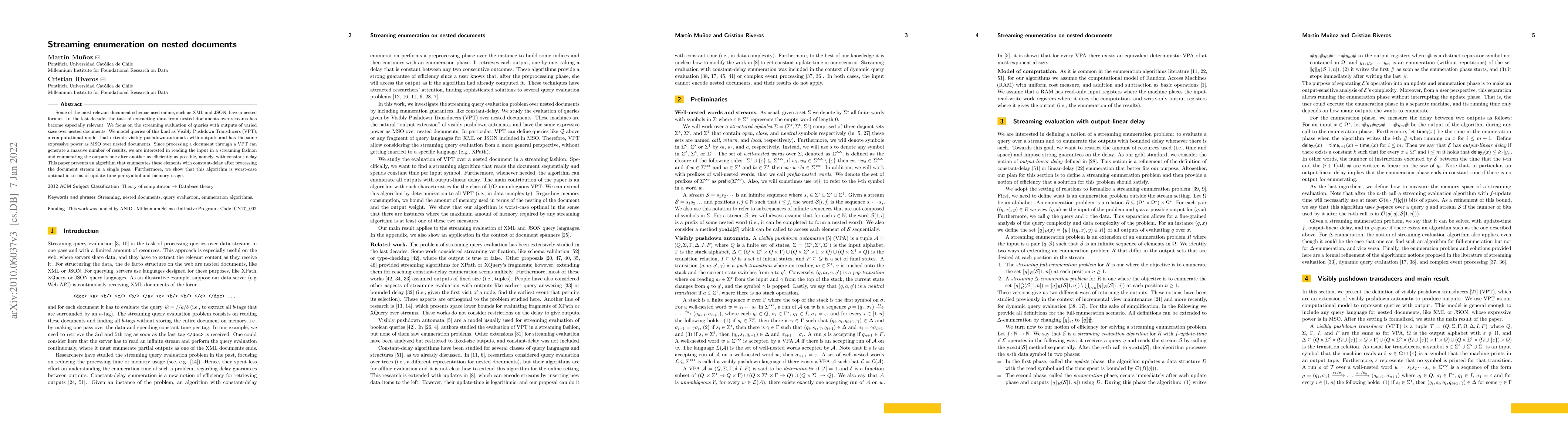 This paper proposes an algorithm for streaming enumeration of query results over nested documents, modeled as Visibly Pushdown Transducers (VPT). The algorithm achieves constant-delay enumeration in a single pass, demonstrating worst-case optimal update-time and memory usage.