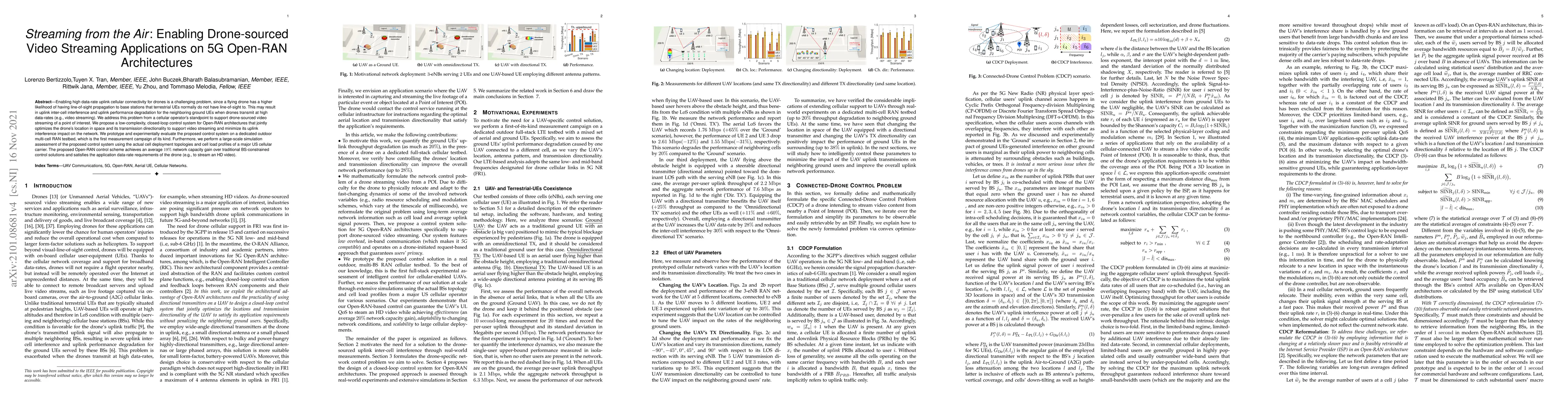 This paper proposes a low-complexity control system for 5G Open-RAN architectures to enable drone-sourced video streaming while minimizing interference to ground users. The system optimizes drone positioning and transmission directionality, achieving a 19% network capacity gain and meeting drone data-rate requirements.