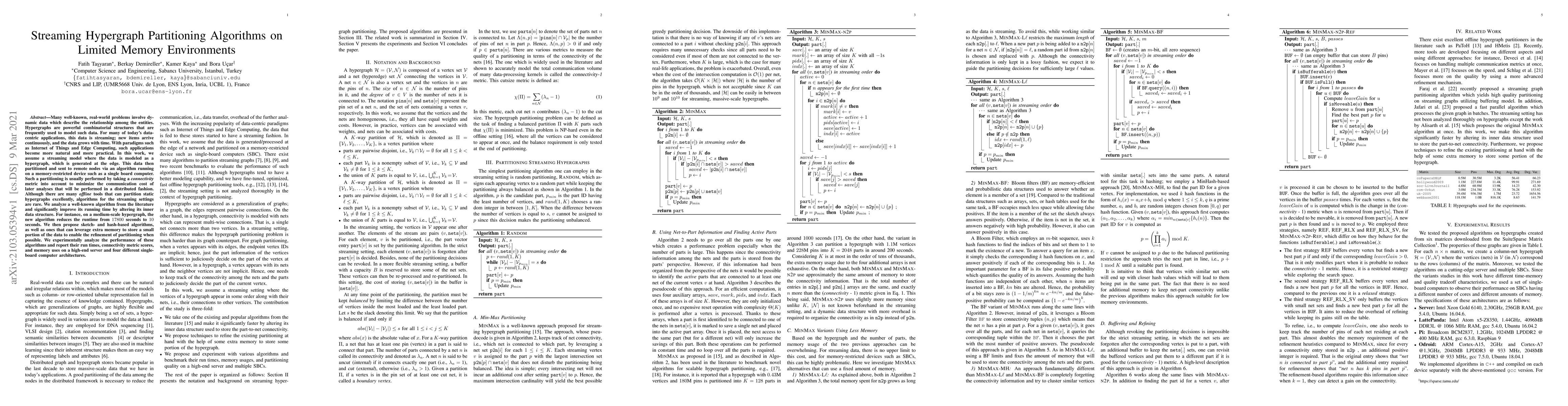 This paper presents algorithms for streaming hypergraph partitioning on memory-constrained devices, addressing the challenge of dynamically modeling and partitioning evolving data relationships. The authors enhance a well-known algorithm, significantly reducing runtime, and propose sketch-based and hash-based methods for improved efficiency and performance across various hardware platforms.