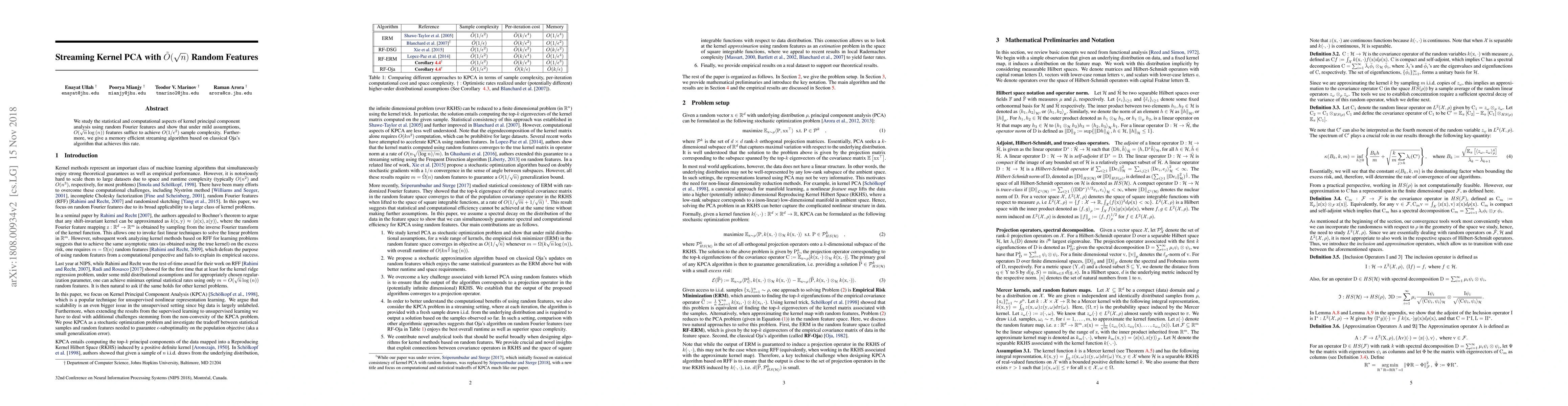 This paper introduces a streaming algorithm for kernel principal component analysis that requires $O( ext{sqrt}(n) ext{log} n)$ random features to achieve $O(1/ ext{epsilon}^2)$ sample complexity.