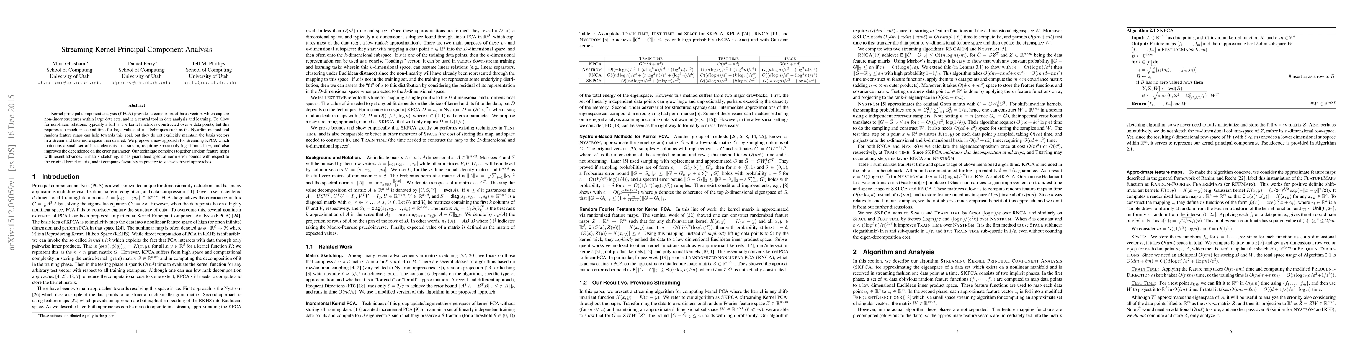 This paper proposes a novel streaming approach for Kernel Principal Component Analysis (KPCA) that maintains a small set of basis elements in a stream, requiring space logarithmic in the number of data points. It combines random feature maps with matrix sketching to achieve efficient computation and maintains guaranteed spectral norm error bounds.