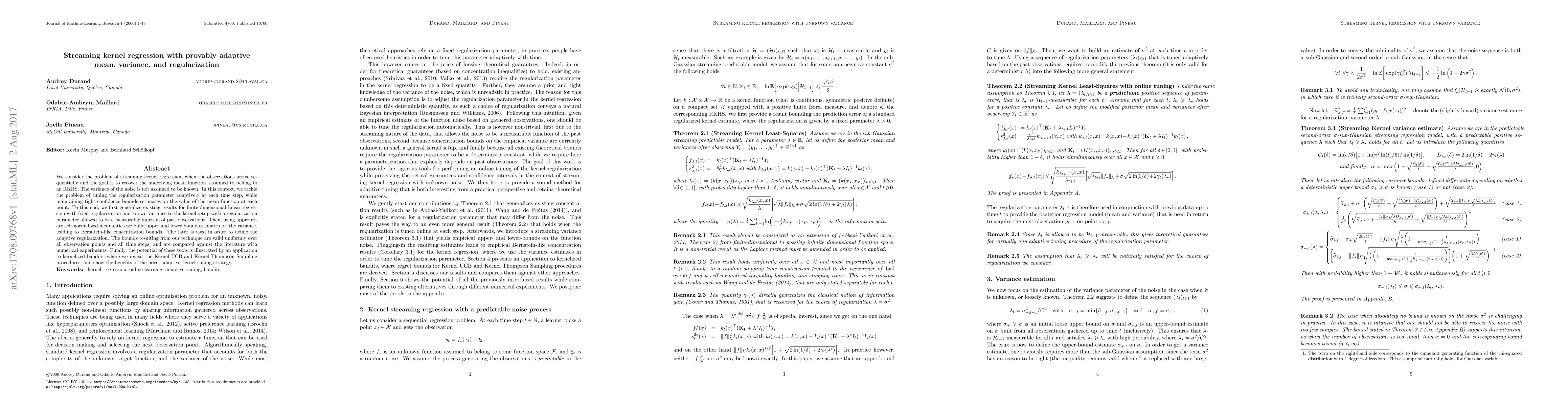 This paper develops a streaming kernel regression method that adaptively tunes the regularization parameter based on past observations, ensuring tight confidence bounds on mean function estimates. The approach generalizes existing linear regression results to kernel methods and employs self-normalized inequalities to adaptively estimate noise variance, leading to improved performance in kernelized bandits.