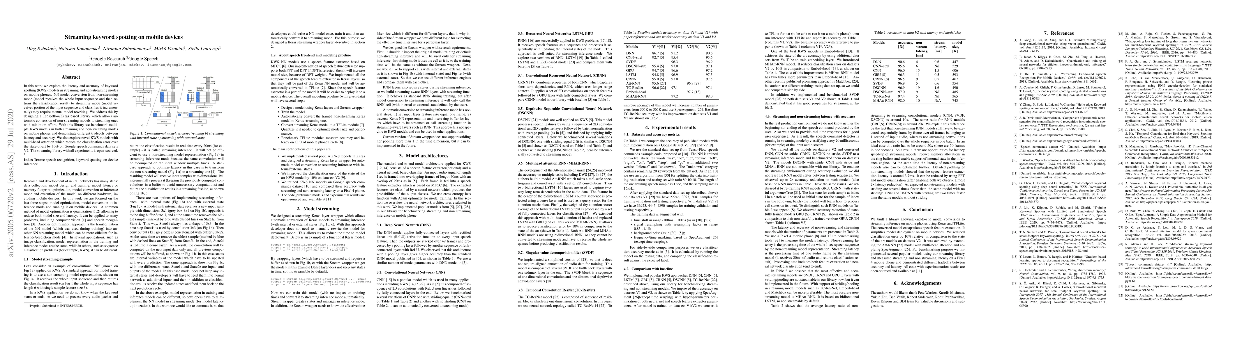In this work we explore the latency and accuracy of keyword spotting (KWS) models in streaming and non-streaming modes on mobile phones. NN model conversion from non-streaming mode (model receives the whole input sequence and then returns the classification result) to streaming mode (model receives portion of the input sequence and classifies it incrementally) may require manual model rewriting. We address this by designing a Tensorflow/Keras based library which allows automatic conversion of non-streaming models to streaming ones with minimum effort. With this library we benchmark multiple KWS models in both streaming and non-streaming modes on mobile phones and demonstrate different tradeoffs between latency and accuracy. We also explore novel KWS models with multi-head attention which reduce the classification error over the state-of-art by 10% on Google speech commands data sets V2. The streaming library with all experiments is open-sourced.