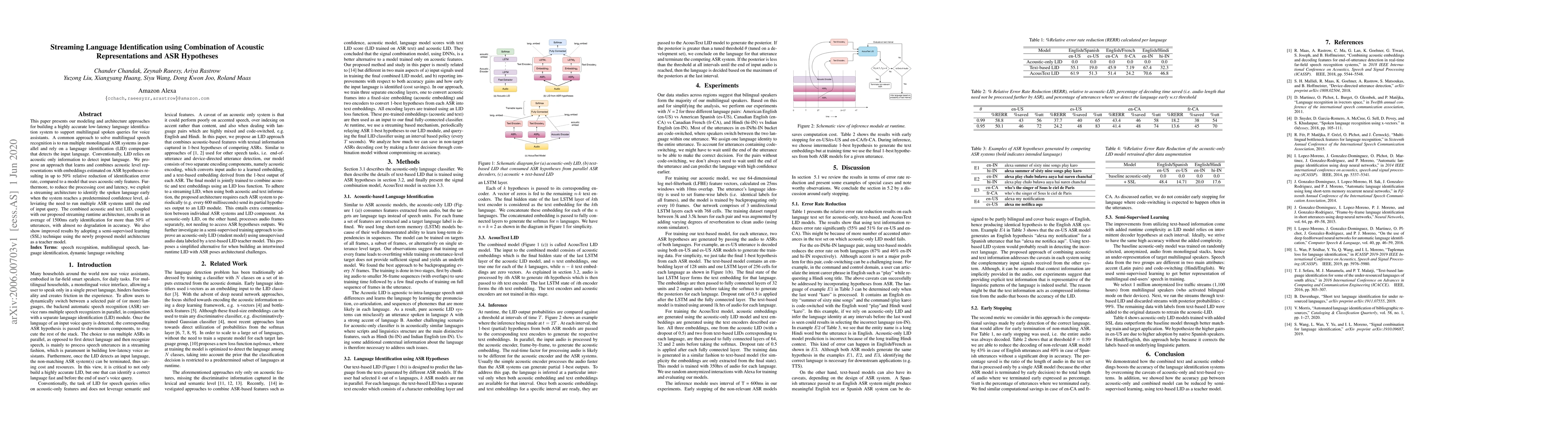 This paper proposes a language identification system that combines acoustic representations with ASR hypotheses to reduce error rates by up to 50%. It also presents a streaming architecture for early language detection, achieving average 1500ms identification time with minimal accuracy loss.