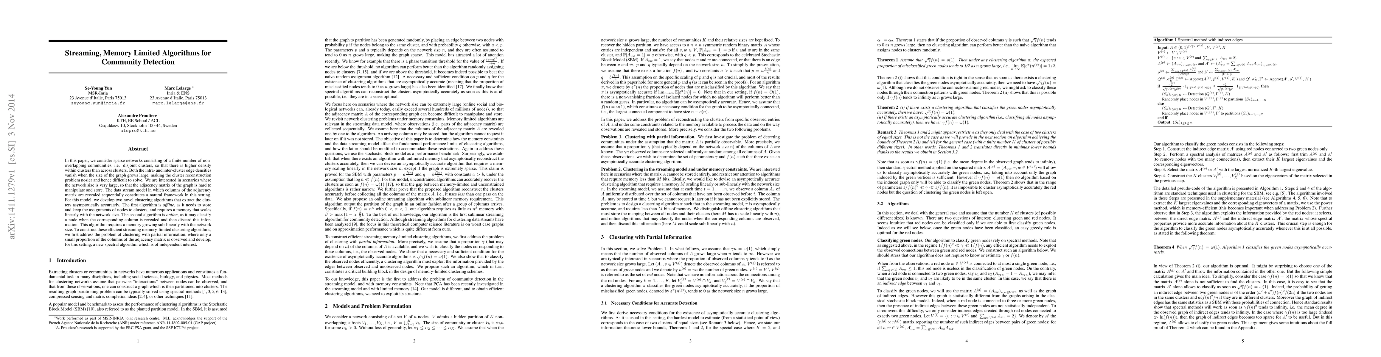 This paper develops two novel algorithms for community detection in large, sparse networks using a streaming model. The offline algorithm requires linear memory scaling with network size, while the online algorithm uses sub-linear memory. Both algorithms aim to accurately extract clusters despite the noisy nature of large-scale networks.