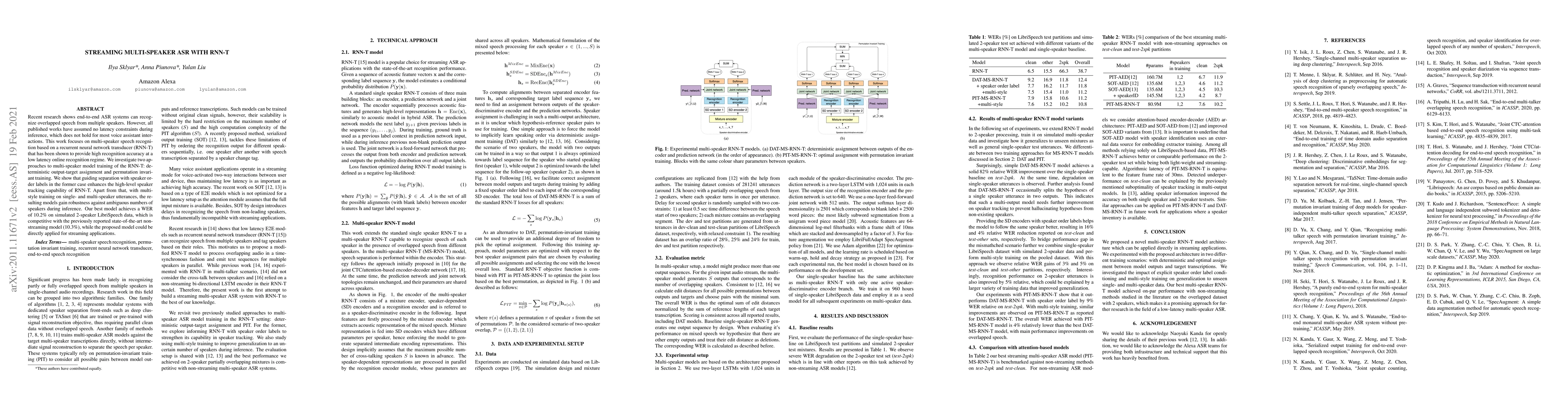 Recent research shows end-to-end ASR systems can recognize overlapped speech from multiple speakers. However, all published works have assumed no latency constraints during inference, which does not hold for most voice assistant interactions. This work focuses on multi-speaker speech recognition based on a recurrent neural network transducer (RNN-T) that has been shown to provide high recognition accuracy at a low latency online recognition regime. We investigate two approaches to multi-speaker model training of the RNN-T: deterministic output-target assignment and permutation invariant training. We show that guiding separation with speaker order labels in the former case enhances the high-level speaker tracking capability of RNN-T. Apart from that, with multistyle training on single- and multi-speaker utterances, the resulting models gain robustness against ambiguous numbers of speakers during inference. Our best model achieves a WER of 10.2% on simulated 2-speaker LibriSpeech data, which is competitive with the previously reported state-of-the-art nonstreaming model (10.3%), while the proposed model could be directly applied for streaming applications.