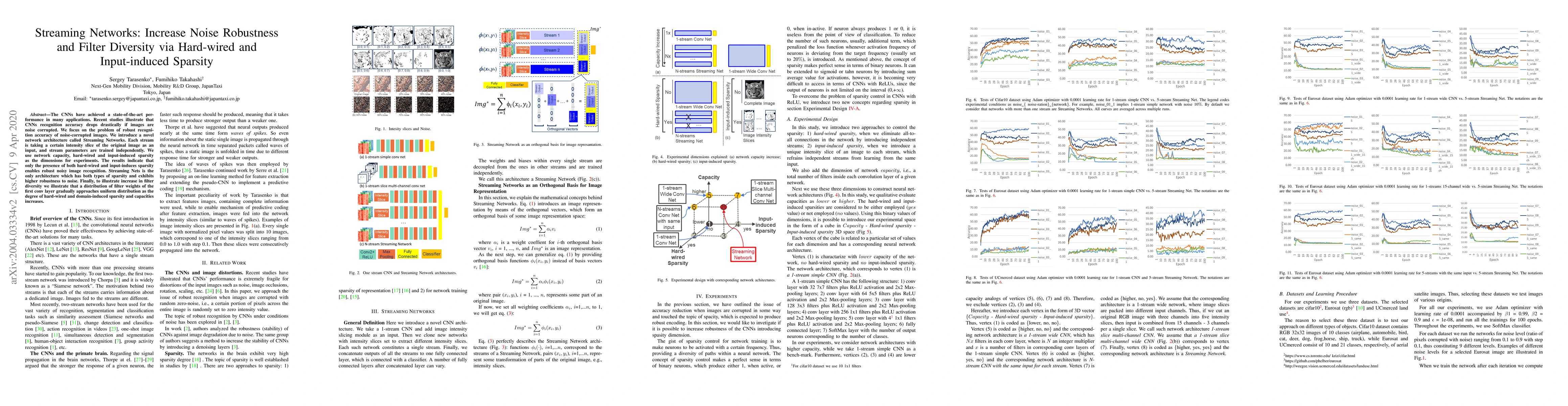 This paper proposes Streaming Networks, a novel CNN architecture that enhances noise robustness through hard-wired and input-induced sparsity. The results show that only networks with both types of sparsity achieve higher robustness to noise, and increased sparsity leads to a more uniform distribution of filter weights, enhancing filter diversity.