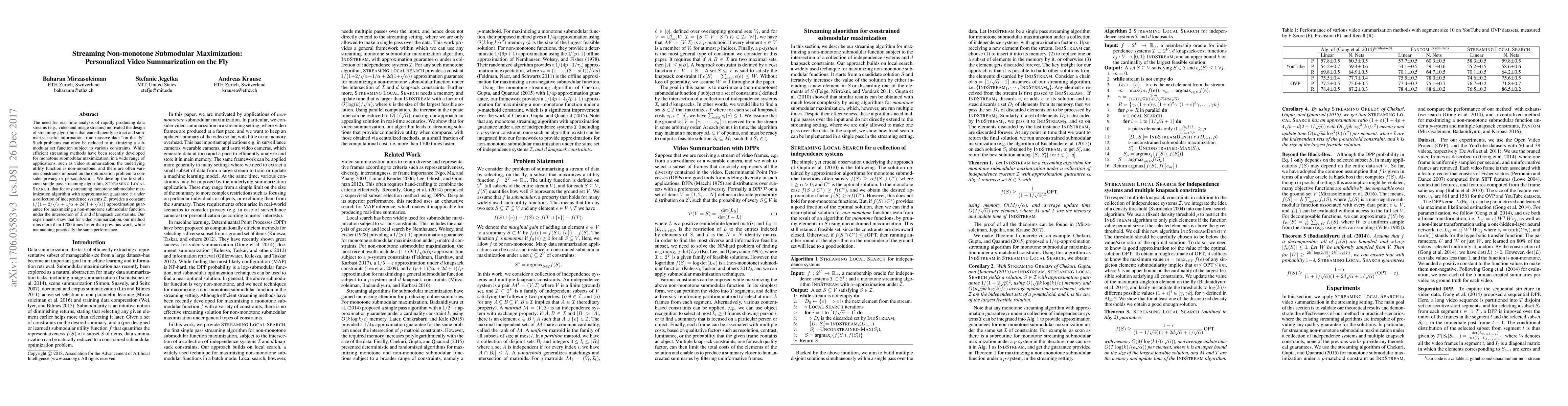 This paper introduces Streaming Local Search, a novel single-pass streaming algorithm for efficiently maximizing non-monotone submodular functions under knapsack constraints, applicable to real-time data summarization like video summarization. The method provides a constant approximation guarantee and significantly outperforms previous techniques, running over 1700 times faster while maintaining comparable performance.
