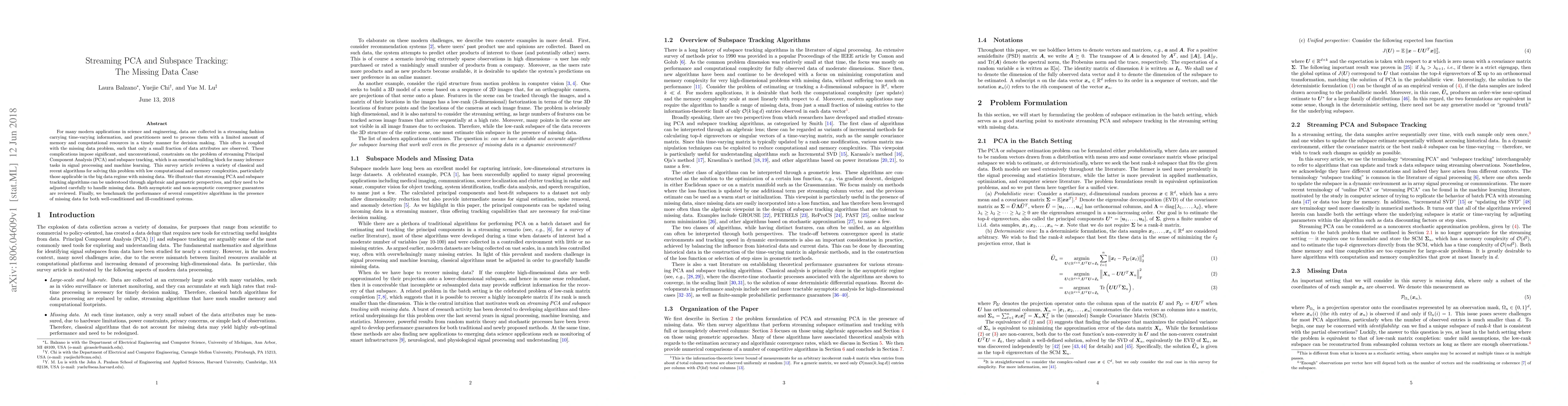 This paper surveys algorithms for streaming PCA and subspace tracking under the constraints of limited memory and computational resources, focusing on scenarios with missing data. It reviews both classical and recent methods, emphasizing their performance in big data contexts, and evaluates their convergence guarantees and practical effectiveness.
