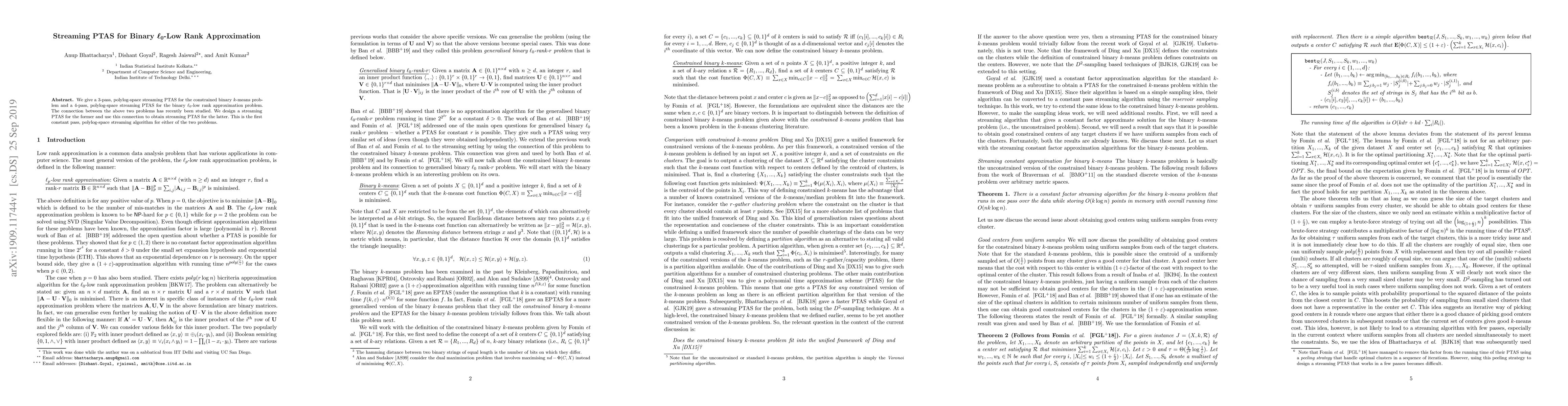 This paper presents a 3-pass, polylog-space streaming PTAS for the constrained binary $k$-means problem and a 4-pass, polylog-space streaming PTAS for the binary $\ell_0$-low rank approximation problem, establishing the first constant pass, polylog-space streaming algorithms for both.