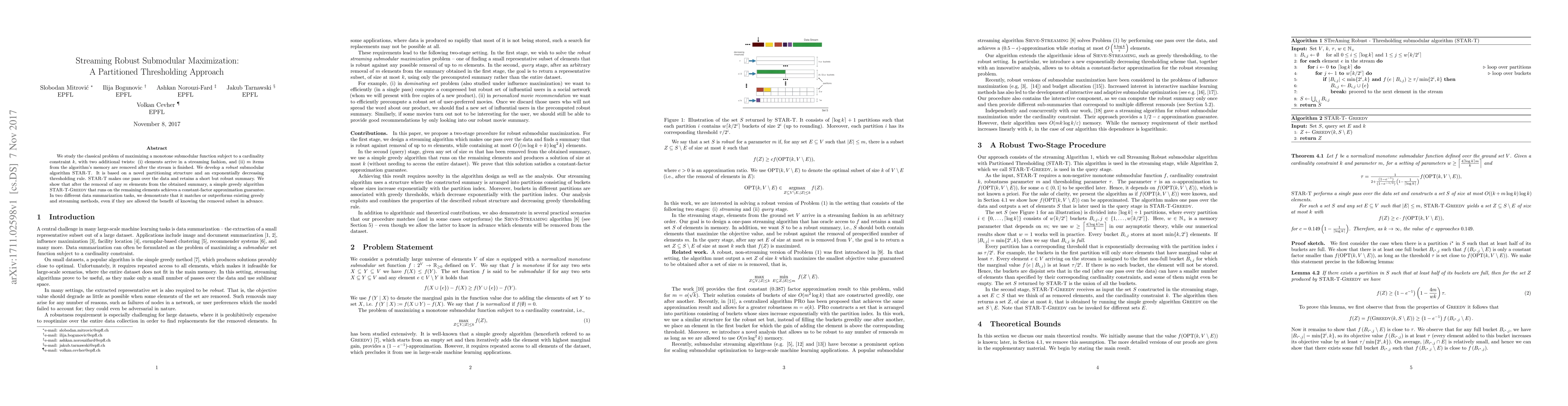 We study the classical problem of maximizing a monotone submodular function subject to a cardinality constraint k, with two additional twists: (i) elements arrive in a streaming fashion, and (ii) m items from the algorithm's memory are removed after the stream is finished. We develop a robust submodular algorithm STAR-T. It is based on a novel partitioning structure and an exponentially decreasing thresholding rule. STAR-T makes one pass over the data and retains a short but robust summary. We show that after the removal of any m elements from the obtained summary, a simple greedy algorithm STAR-T-GREEDY that runs on the remaining elements achieves a constant-factor approximation guarantee. In two different data summarization tasks, we demonstrate that it matches or outperforms existing greedy and streaming methods, even if they are allowed the benefit of knowing the removed subset in advance.