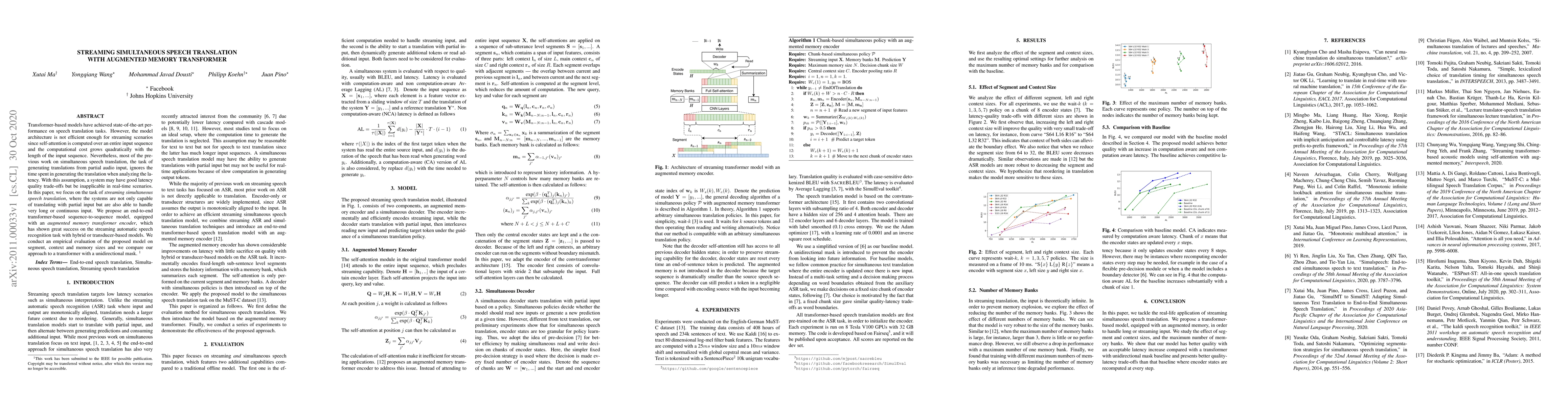 This paper proposes an augmented memory transformer model for efficient streaming simultaneous speech translation, addressing the inefficiency of traditional transformer models in real-time scenarios. The model is evaluated for its performance on different segment, context, and memory sizes, demonstrating improved efficiency over conventional transformer-based methods.